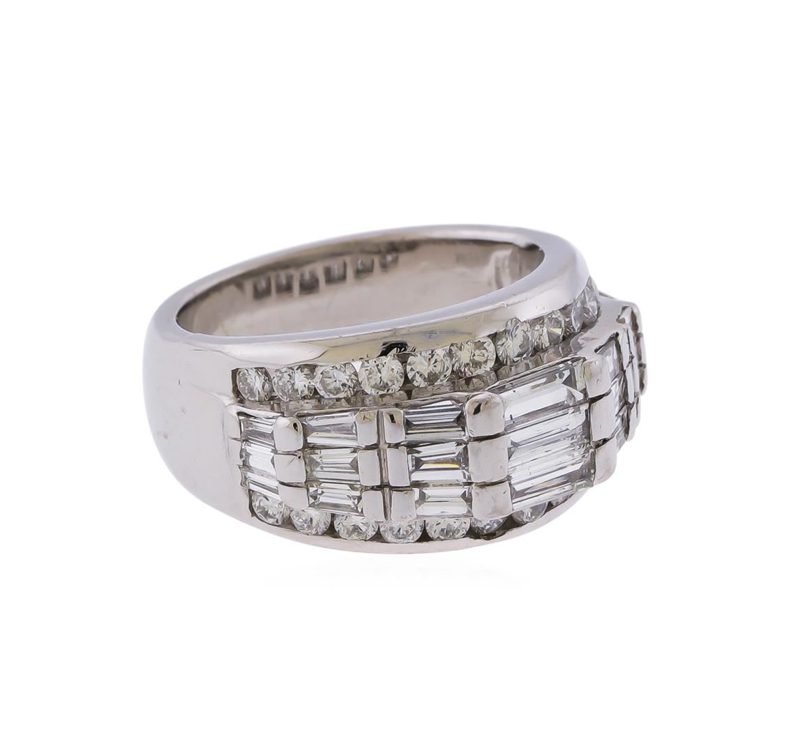 Eighteen karat 18K) white gold round brilliant and baguette cut diamond ring. Round brilliant and baguette cut diamonds, weighing approximately 3.02ctw with an average clarity of VS2-SI1 and an average color of F-G, are mounted throughout the center and on both sides of the ring. The ring is cast stamped "18k" and has a gross weight of 15.6 grams. GGA Appraised.