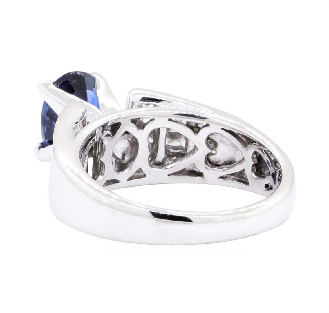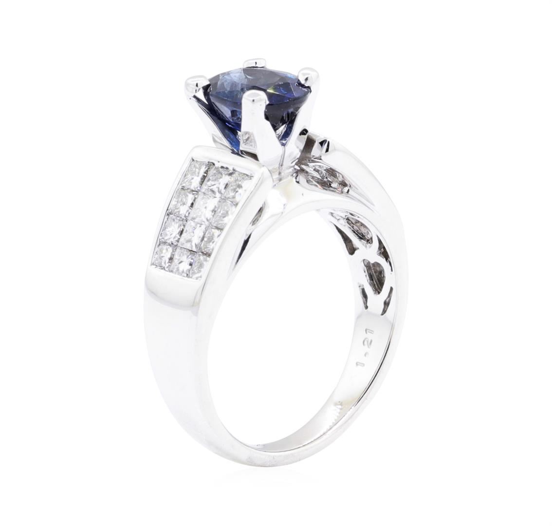 One electronically tested 18KT white gold lady's cast fashion ring with a tapered cathedral shank with a bright polish finish. The featured lady's ring has a shank measuring 2.72 millimeters wide. Identified with markings of '18K 750'. Condition is like new, good workmanship. Containing: One prong set oval modified mixed cut natural blue sapphire, measuring 8.10 x 5.95 x 4.17mm, (depth est.) 5%. bulge factor, approximate weight of 1.80ct., clarity is slightly included, dark, moderately strong, very slightly greenish blue color, (GIA vslgB 7/4), cut is good. Transmitting light with a minimum of distortion, transparent. Colored gemstones are presumed to have been subjected to commonly used enhancement processes. Graded in the setting. Twenty-Four invisible set princess cut diamonds, measuring 2.40 x 2.00 x 1.50mm (depth est.) approximate total weight of 24 Stones = 1.50ct. Graded in the setting. Color H - I Clarity VS-1 to VS-2 Cut Very Good. Total Weight of Colored Stones 1.80ct. Total Weight of Diamonds 1.50ct. Total Weight of Ring 6.80gm. GAS Appraised.