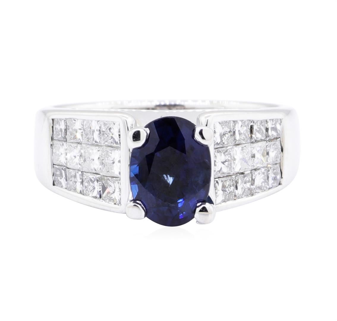 One electronically tested 18KT white gold lady's cast fashion ring with a tapered cathedral shank with a bright polish finish. The featured lady's ring has a shank measuring 2.72 millimeters wide. Identified with markings of '18K 750'. Condition is like new, good workmanship. Containing: One prong set oval modified mixed cut natural blue sapphire, measuring 8.10 x 5.95 x 4.17mm, (depth est.) 5%. bulge factor, approximate weight of 1.80ct., clarity is slightly included, dark, moderately strong, very slightly greenish blue color, (GIA vslgB 7/4), cut is good. Transmitting light with a minimum of distortion, transparent. Colored gemstones are presumed to have been subjected to commonly used enhancement processes. Graded in the setting. Twenty-Four invisible set princess cut diamonds, measuring 2.40 x 2.00 x 1.50mm (depth est.) approximate total weight of 24 Stones = 1.50ct. Graded in the setting. Color H - I Clarity VS-1 to VS-2 Cut Very Good. Total Weight of Colored Stones 1.80ct. Total Weight of Diamonds 1.50ct. Total Weight of Ring 6.80gm. GAS Appraised.