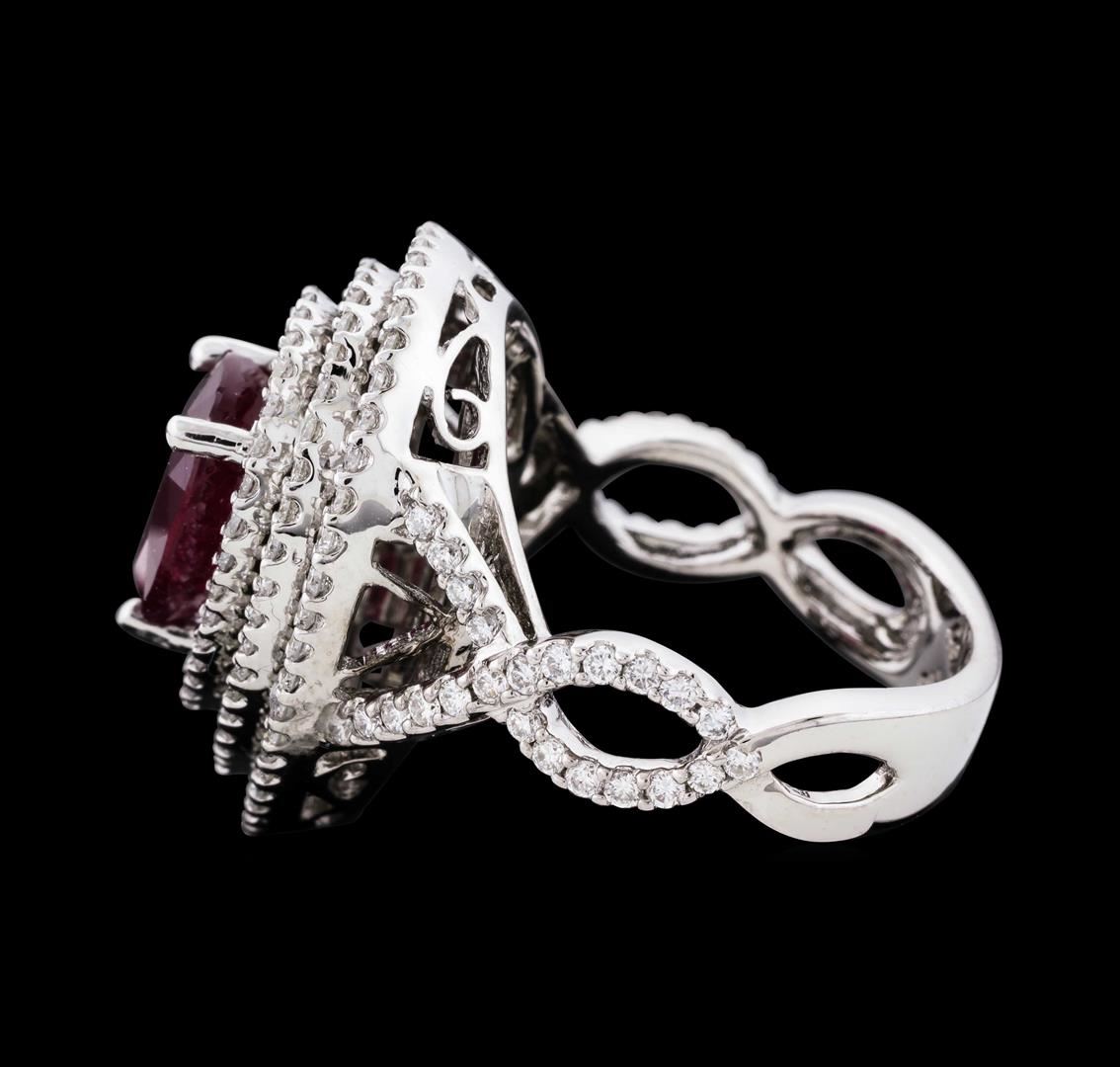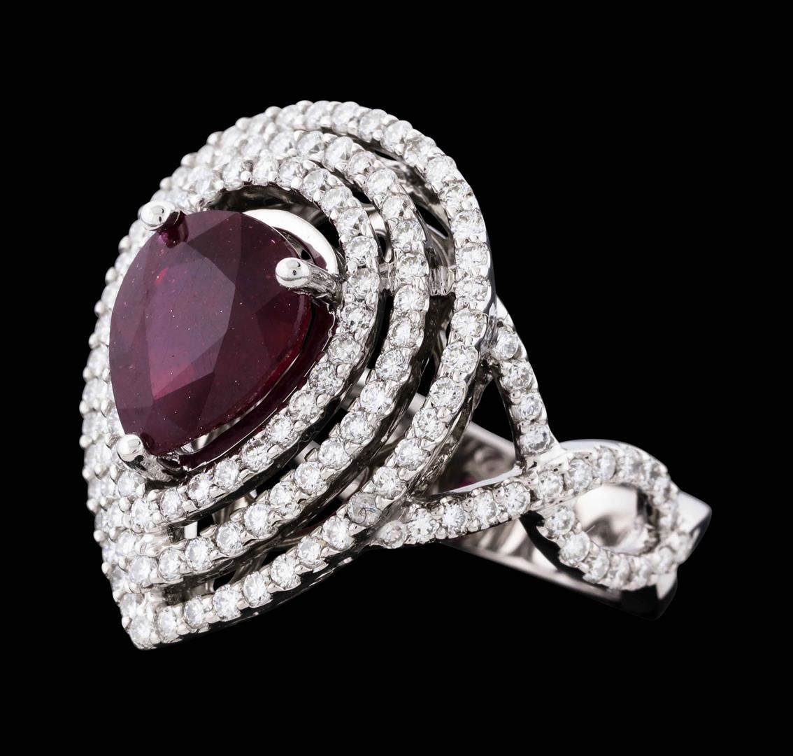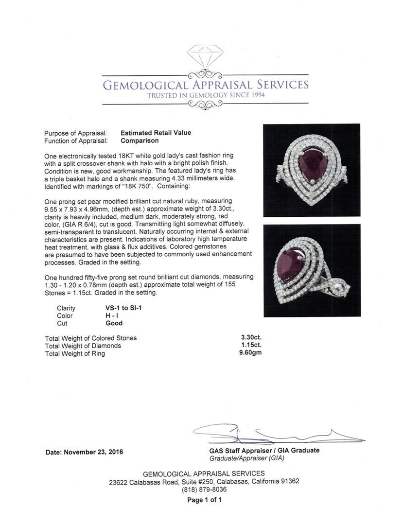 One electronically tested 18KT white gold lady's cast fashion ring with a split crossover shank with halo with a bright polish finish. The featured lady's ring has a triple basket halo and a shank measuring 4.33 millimeters wide. Identified with markings of "18K 750". Condition is new, good workmanship. Containing: One prong set pear modified brilliant cut natural ruby, measuring 9.55 x 7.93 x 4.96mm, (depth est.) approximate weight of 3.30ct., clarity is heavily included, medium dark, moderately strong, red color, (GIA R 6/4), cut is good. Transmitting light somewhat diffusely, semi-transparent to translucent. Naturally occurring internal & external characteristics are present. Indications of laboratory high temperature heat treatment, with glass & flux additives. Colored gemstones are presumed to have been subjected to commonly used enhancement processes. Graded in the setting. One Hundred Fifty-Five prong set round brilliant cut diamonds, measuring 1.30 - 1.20 x 0.78mm (depth est.) approximate total weight of 155 Stones = 1.15ct. Graded in the setting. Clarity: VS-1 to SI-1. Color: H - ICut Good. Total Weight of Colored Stones 3.30ct. Total Weight of Diamonds 1.15ct. Total Weight of Ring 9.60gm. GAS Appraised.