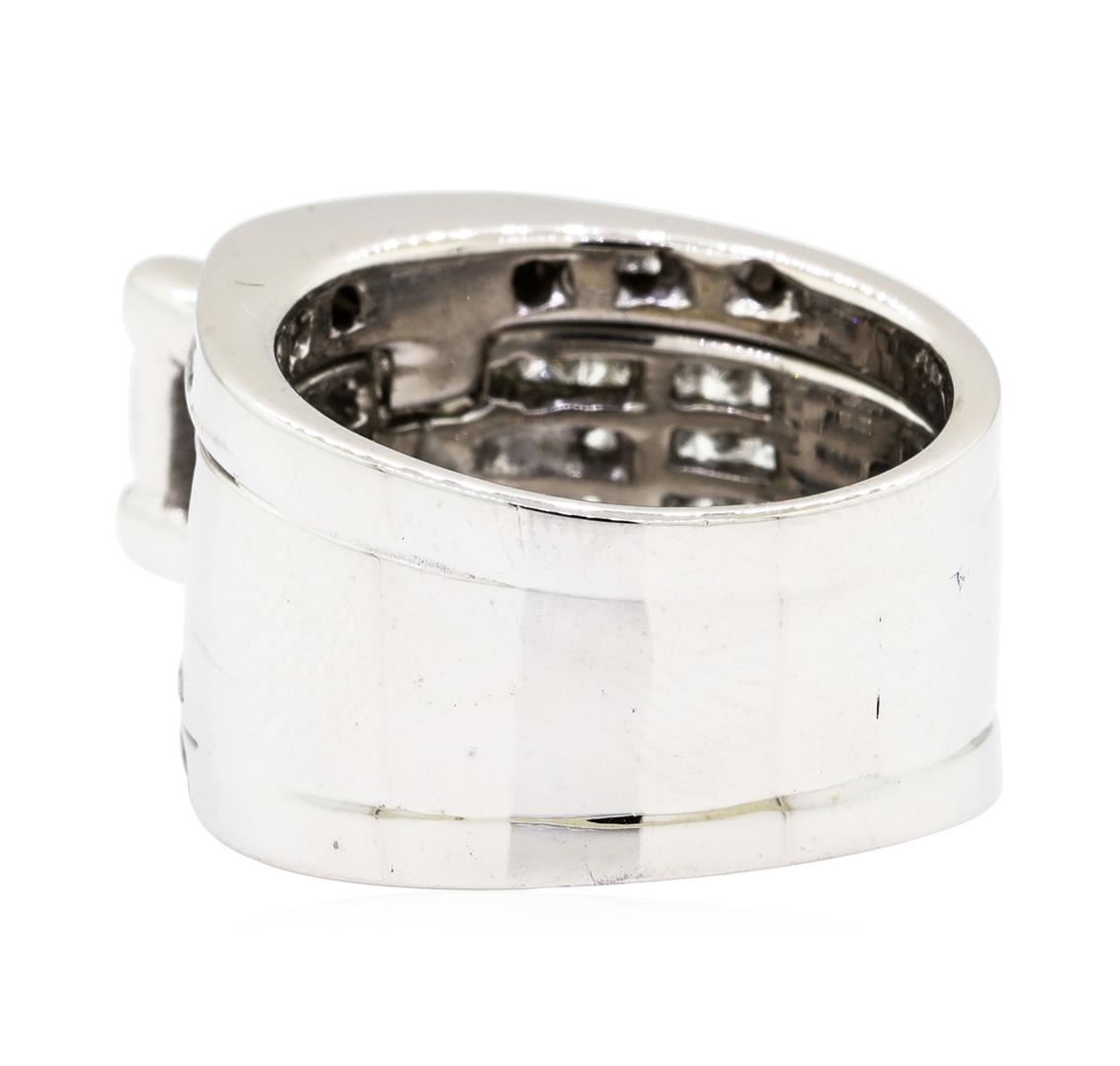 One set electronically tested 18KT white gold lady's combination cast & assembled wedding ring soldered to wedding bands with a three row wide band with a bright polish finish. The featured lady's ring has a triple shank measuring 10.00 millimeters wide. Identified with markings of '18K'. Condition is like new, good workmanship. Containing: Nine invisible set princess cut diamonds, measuring 2.60 x 2.50 x 1.88mm (depth est.) approximate total weight of 9 Stones = 0.90ct. Graded in the setting. Color H - I Clarity VS-2 to SI-2 Cut Very Good Seventy-Six invisible set princess cut diamonds, measuring 1.80 x 1.75 x 1.31mm (depth est.) approximate total weight of 76 Stones = 2.60ct. Graded in the setting. Color H - I Clarity VS-2 to SI-2 Cut Good. Total Weight of Diamonds 3.50ct.. Total Weight of Ring Soldered To Wedding Bands 21.10gm. GAS Appraised.