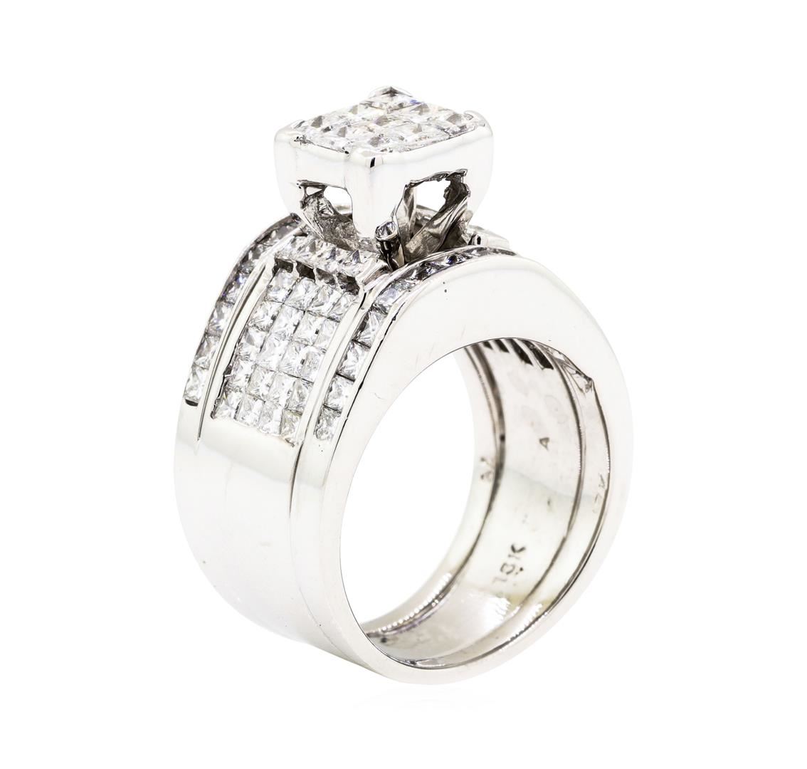 One set electronically tested 18KT white gold lady's combination cast & assembled wedding ring soldered to wedding bands with a three row wide band with a bright polish finish. The featured lady's ring has a triple shank measuring 10.00 millimeters wide. Identified with markings of '18K'. Condition is like new, good workmanship. Containing: Nine invisible set princess cut diamonds, measuring 2.60 x 2.50 x 1.88mm (depth est.) approximate total weight of 9 Stones = 0.90ct. Graded in the setting. Color H - I Clarity VS-2 to SI-2 Cut Very Good Seventy-Six invisible set princess cut diamonds, measuring 1.80 x 1.75 x 1.31mm (depth est.) approximate total weight of 76 Stones = 2.60ct. Graded in the setting. Color H - I Clarity VS-2 to SI-2 Cut Good. Total Weight of Diamonds 3.50ct.. Total Weight of Ring Soldered To Wedding Bands 21.10gm. GAS Appraised.