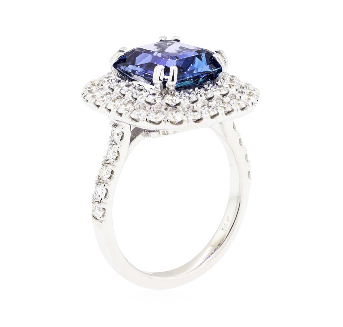One electronically tested 18KT white gold lady's cast fashion ring with a double cushion halo with a bright polish finish. The featured lady's ring has a shank measuring 2.25 millimeters wide. Identified with markings of '18K'. Condition is new, good workmanship. Containing: One prong set emerald modified step cut natural tanzanite, measuring 9.68 x 8.60 x 4.55mm, (depth est.) 5%. bulge factor, approximate weight of 3.60ct., clarity is eye clean, medium, moderately strong, violetish blue color, (GIA vB 5/4), cut is very good. Transmitting light with no distortion, transparent. Colored gemstones are presumed to have been subjected to commonly used enhancement processes. Graded in the setting. Fifty-Four prong set round brilliant cut diamonds, measuring 2.00 - 1.95 x 1.19mm (depth est.) approximate total weight of 54 Stones = 1.50ct. Graded in the setting. Color F - G Clarity VS-1 to VS-2 Cut Very Good. Total Weight of Colored Stones 3.60ct.. Total Weight of Diamonds 1.50ct.. Total Weight of Ring 7.60gm. GAS Appraised.
