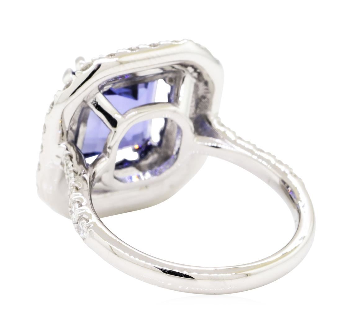 One electronically tested 18KT white gold lady's cast fashion ring with a double cushion halo with a bright polish finish. The featured lady's ring has a shank measuring 2.25 millimeters wide. Identified with markings of '18K'. Condition is new, good workmanship. Containing: One prong set emerald modified step cut natural tanzanite, measuring 9.68 x 8.60 x 4.55mm, (depth est.) 5%. bulge factor, approximate weight of 3.60ct., clarity is eye clean, medium, moderately strong, violetish blue color, (GIA vB 5/4), cut is very good. Transmitting light with no distortion, transparent. Colored gemstones are presumed to have been subjected to commonly used enhancement processes. Graded in the setting. Fifty-Four prong set round brilliant cut diamonds, measuring 2.00 - 1.95 x 1.19mm (depth est.) approximate total weight of 54 Stones = 1.50ct. Graded in the setting. Color F - G Clarity VS-1 to VS-2 Cut Very Good. Total Weight of Colored Stones 3.60ct.. Total Weight of Diamonds 1.50ct.. Total Weight of Ring 7.60gm. GAS Appraised.
