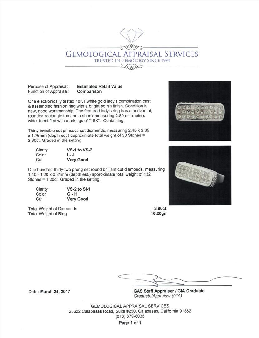 One electronically tested 18KT white gold lady's combination cast & assembled fashion ring with a bright polish finish. The featured lady's ring has a horizontal, rounded rectangle top and a shank measuring 2.80 millimeters wide. Identified with markings of "18K". Condition is new, good workmanship. Containing: Thirty invisible set princess cut diamonds, measuring 2.45 x 2.35 x 1.76mm (depth est.) approximate. Total Weight of 30 Stones = 2.60ct. Graded in the setting. Color I - JClarity VS-1 to VS-2 Cut Very Good One Hundred Thirty-Two prong set round brilliant cut diamonds, measuring 1.40 - 1.20 x 0.81mm (depth est.) approximate. Total Weight of 132 Stones = 1.20ct. Graded in the setting. Color G - HClarity VS-2 to SI-1 Cut Very Good. Total Weight of Diamonds 3.80ct.. Total Weight of Ring 16.20gm. GAS Appraised.