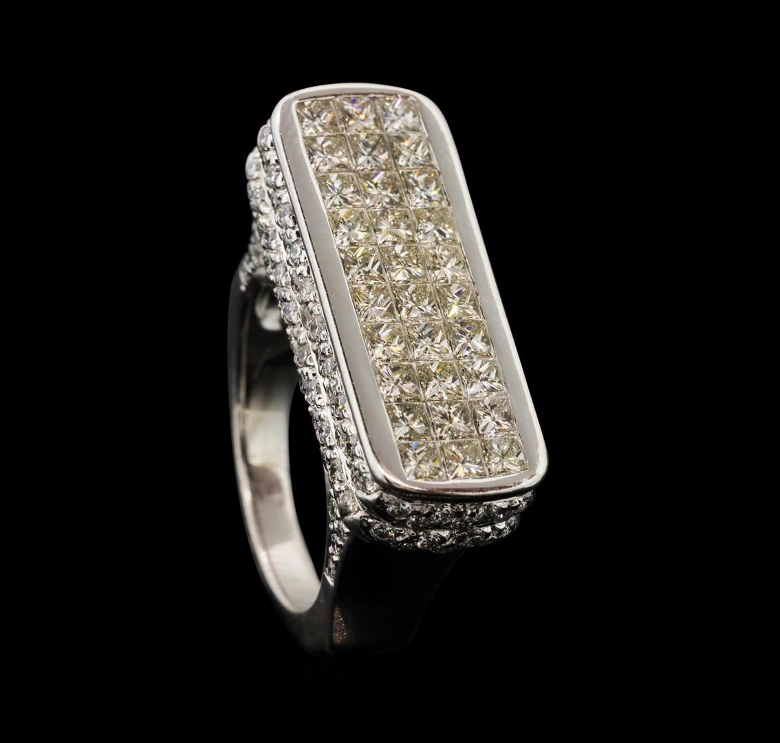 One electronically tested 18KT white gold lady's combination cast & assembled fashion ring with a bright polish finish. The featured lady's ring has a horizontal, rounded rectangle top and a shank measuring 2.80 millimeters wide. Identified with markings of "18K". Condition is new, good workmanship. Containing: Thirty invisible set princess cut diamonds, measuring 2.45 x 2.35 x 1.76mm (depth est.) approximate. Total Weight of 30 Stones = 2.60ct. Graded in the setting. Color I - JClarity VS-1 to VS-2 Cut Very Good One Hundred Thirty-Two prong set round brilliant cut diamonds, measuring 1.40 - 1.20 x 0.81mm (depth est.) approximate. Total Weight of 132 Stones = 1.20ct. Graded in the setting. Color G - HClarity VS-2 to SI-1 Cut Very Good. Total Weight of Diamonds 3.80ct.. Total Weight of Ring 16.20gm. GAS Appraised.