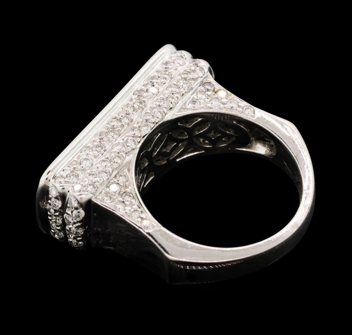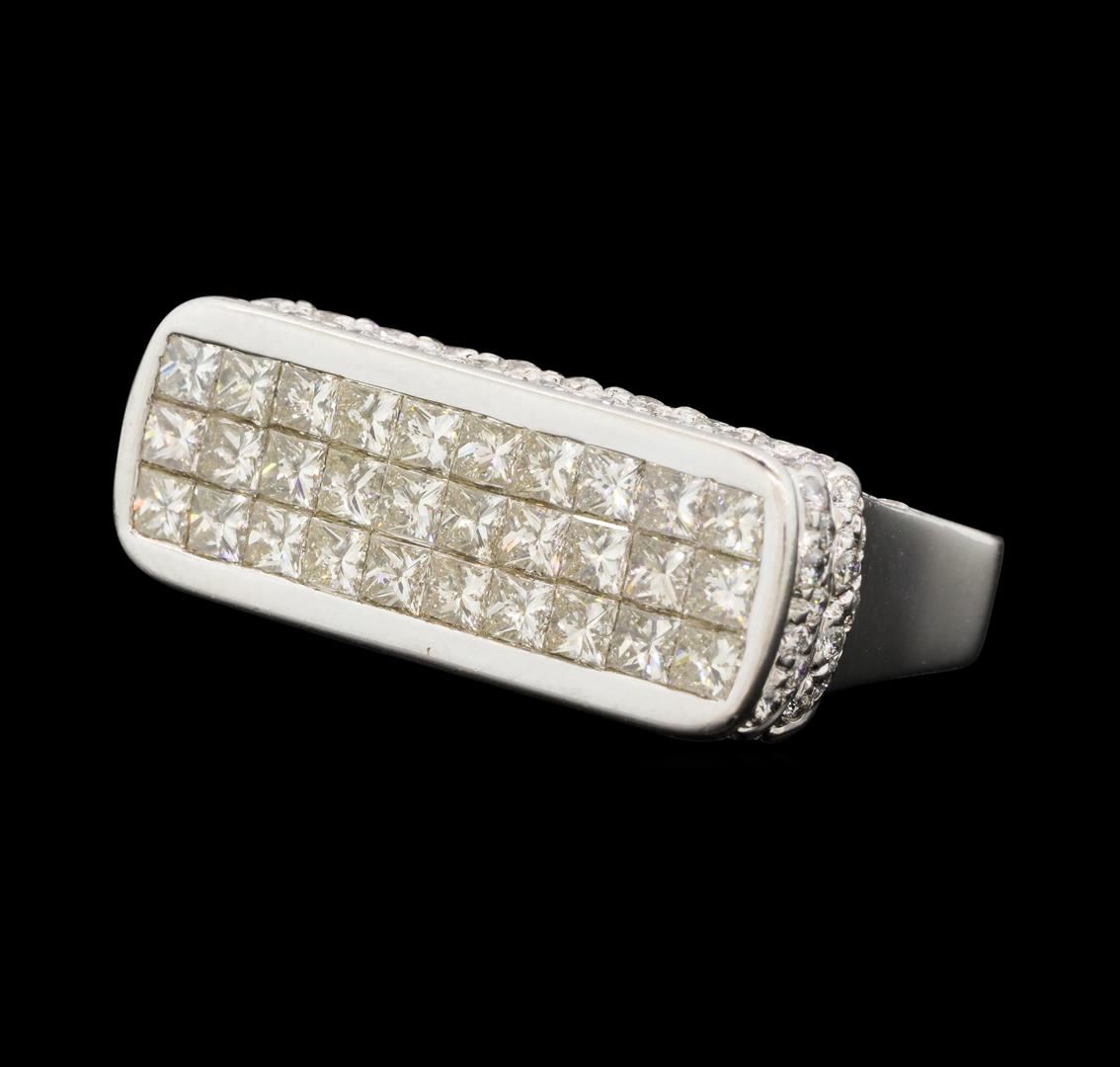 One electronically tested 18KT white gold lady's combination cast & assembled fashion ring with a bright polish finish. The featured lady's ring has a horizontal, rounded rectangle top and a shank measuring 2.80 millimeters wide. Identified with markings of "18K". Condition is new, good workmanship. Containing: Thirty invisible set princess cut diamonds, measuring 2.45 x 2.35 x 1.76mm (depth est.) approximate. Total Weight of 30 Stones = 2.60ct. Graded in the setting. Color I - JClarity VS-1 to VS-2 Cut Very Good One Hundred Thirty-Two prong set round brilliant cut diamonds, measuring 1.40 - 1.20 x 0.81mm (depth est.) approximate. Total Weight of 132 Stones = 1.20ct. Graded in the setting. Color G - HClarity VS-2 to SI-1 Cut Very Good. Total Weight of Diamonds 3.80ct.. Total Weight of Ring 16.20gm. GAS Appraised.