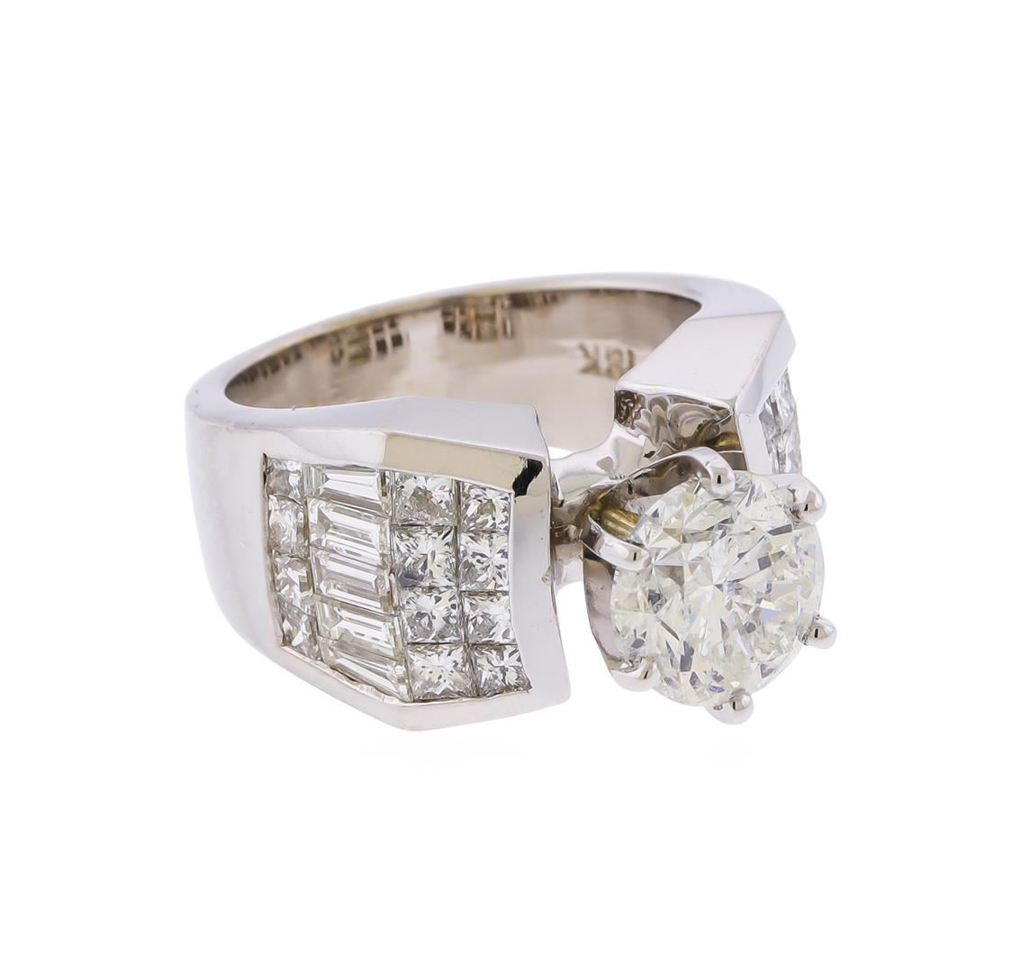 One electronically tested 18KT White Gold lady's combination cast & assembled engagement ring with a bright polish finish. Condition is new. Identified with markings of "18K". Containing: One prong set round brilliant cut diamond, measuring 8.50 - 8.50 x 5.40mm (depth est.) approximate weight of 2.38ct. Clarity of 1-2, color of J, cut is good. Twenty-four invisible set princess cut diamonds. measuring 2.00 x 2-00 x 1.50rnm (depth est.) approximate total weight of 24 Stones = 1.18ct, Clarity of SI-1 to Sl-2, color of J - K. cut is good. Ten invisible set baguette cut diamonds, measuring 3.50 x 1.50 x 1.13mm (depth est.) approximate total weight of 10 Stones =0.60ct. Clarity of VS-2, color of J - K, cut is good. GGL Appraised at $36,070.00.