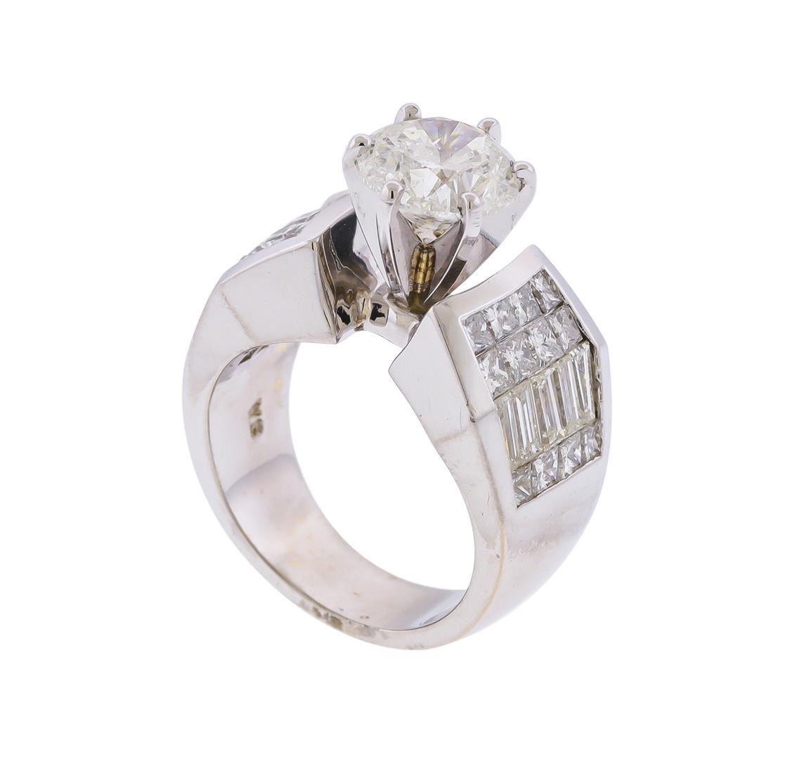 One electronically tested 18KT White Gold lady's combination cast & assembled engagement ring with a bright polish finish. Condition is new. Identified with markings of "18K". Containing: One prong set round brilliant cut diamond, measuring 8.50 - 8.50 x 5.40mm (depth est.) approximate weight of 2.38ct. Clarity of 1-2, color of J, cut is good. Twenty-four invisible set princess cut diamonds. measuring 2.00 x 2-00 x 1.50rnm (depth est.) approximate total weight of 24 Stones = 1.18ct, Clarity of SI-1 to Sl-2, color of J - K. cut is good. Ten invisible set baguette cut diamonds, measuring 3.50 x 1.50 x 1.13mm (depth est.) approximate total weight of 10 Stones =0.60ct. Clarity of VS-2, color of J - K, cut is good. GGL Appraised at $36,070.00.