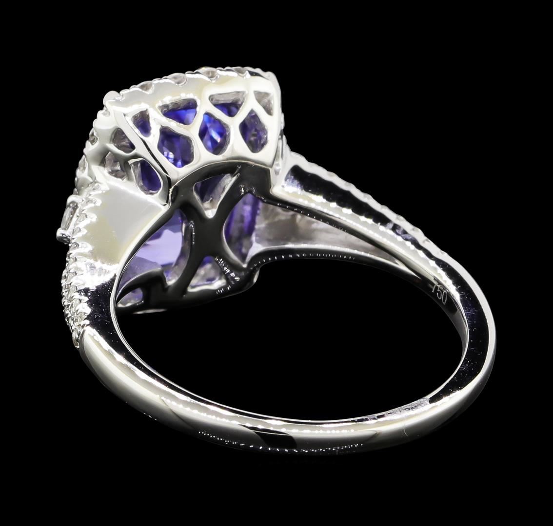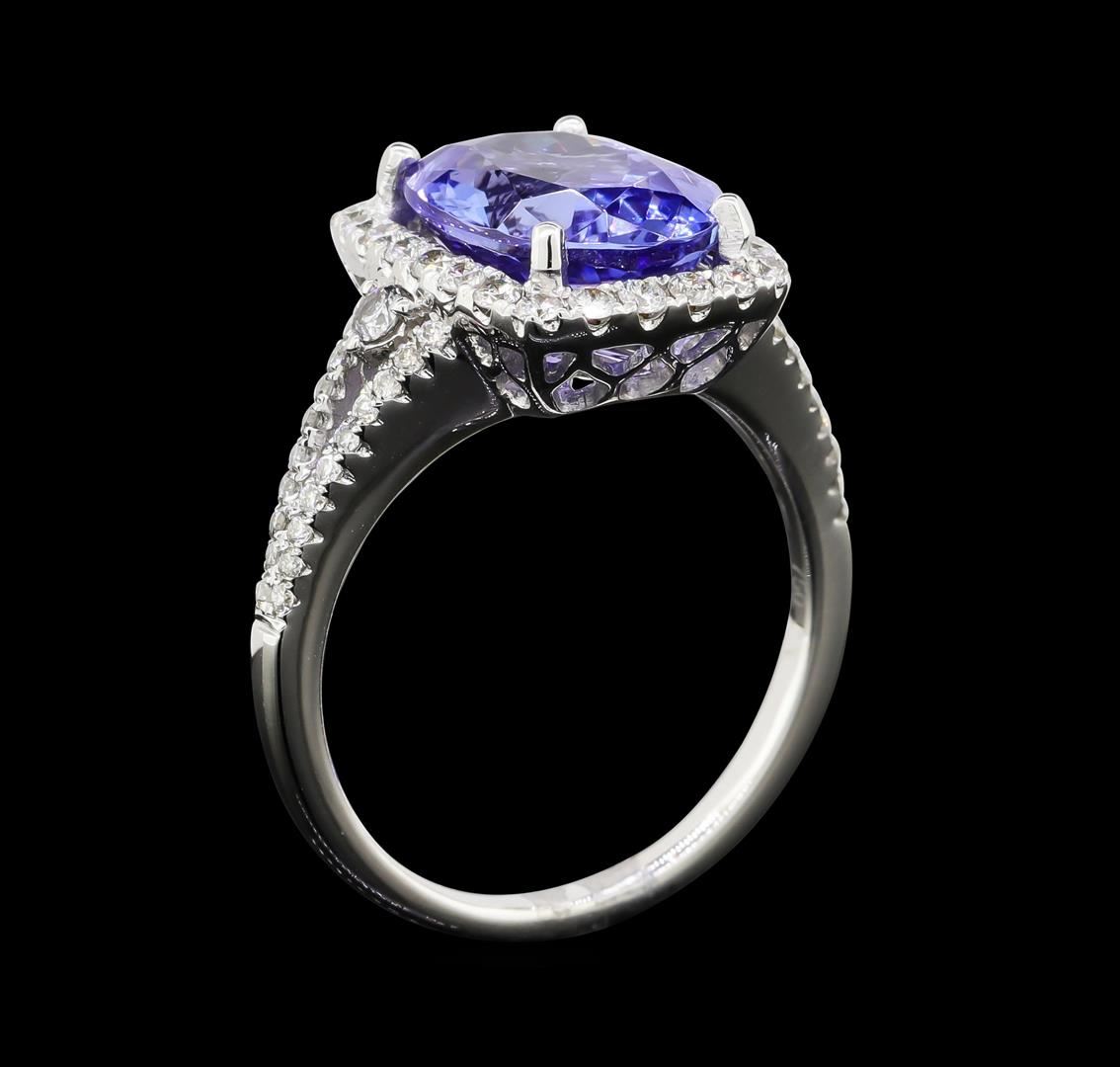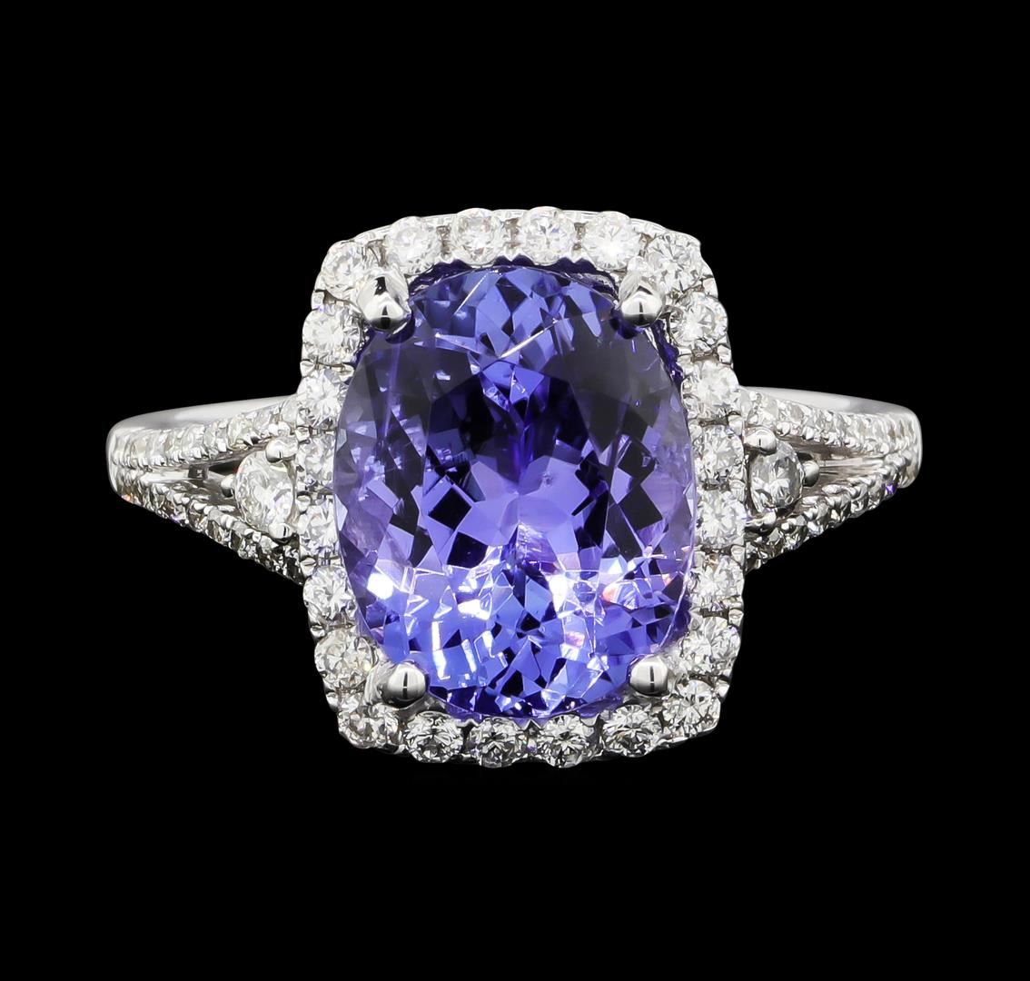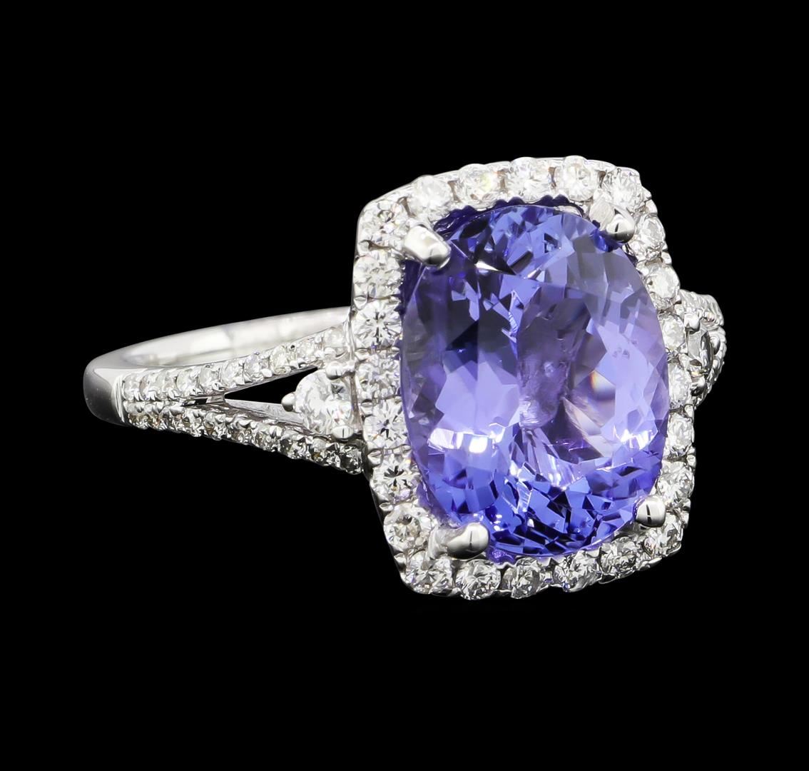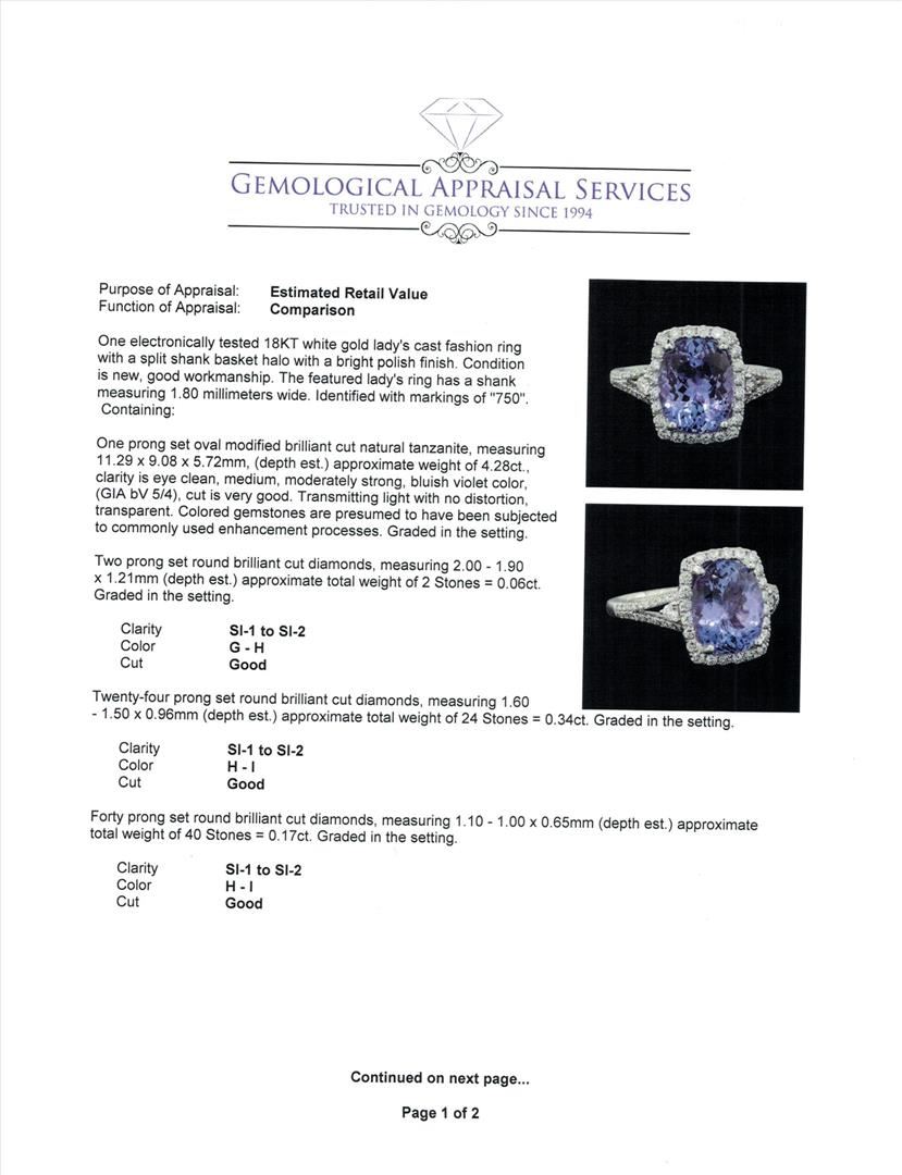 One electronically tested 18KT white gold lady's cast fashion ring with a split shank basket halo with a bright polish finish. The featured lady's ring has a shank measuring 1.80 millimeters wide. Identified with markings of "750". Condition is new, good workmanship. Containing: One prong set oval modified brilliant cut natural tanzanite, measuring 11.29 x 9.08 x 5.72mm, (depth est.) approximate weight of 4.28ct., clarity is eye clean, medium, moderately strong, bluish violet color, (GIA bV 5/4), cut is very good. Transmitting light with no distortion, transparent. Colored gemstones are presumed to have been subjected to commonly used enhancement processes. Graded in the setting.Two prong set round brilliant cut diamonds, measuring 2.00 - 1.90 x 1.21mm (depth est.) approximate total weight of 2 Stones = 0.06ct. Graded in the setting. Clarity: SI-1 to SI-2. Color: G - HCut Good Twenty-Four prong set round brilliant cut diamonds, measuring 1.60 - 1.50 x 0.96mm (depth est.) approximate total weight of 24 Stones = 0.34ct. Graded in the setting. Clarity: SI-1 to SI-2. Color: H - ICut Good Forty prong set round brilliant cut diamonds, measuring 1.10 - 1.00 x 0.65mm (depth est.) approximate total weight of 40 Stones = 0.17ct. Graded in the setting. Clarity: SI-1 to SI-2. Color: H - ICut Good. Total Weight of Colored Stones 4.28ct. Total Weight of Diamonds 0.57ct. Total Weight of Ring 6.00gm. GAS Appraised.