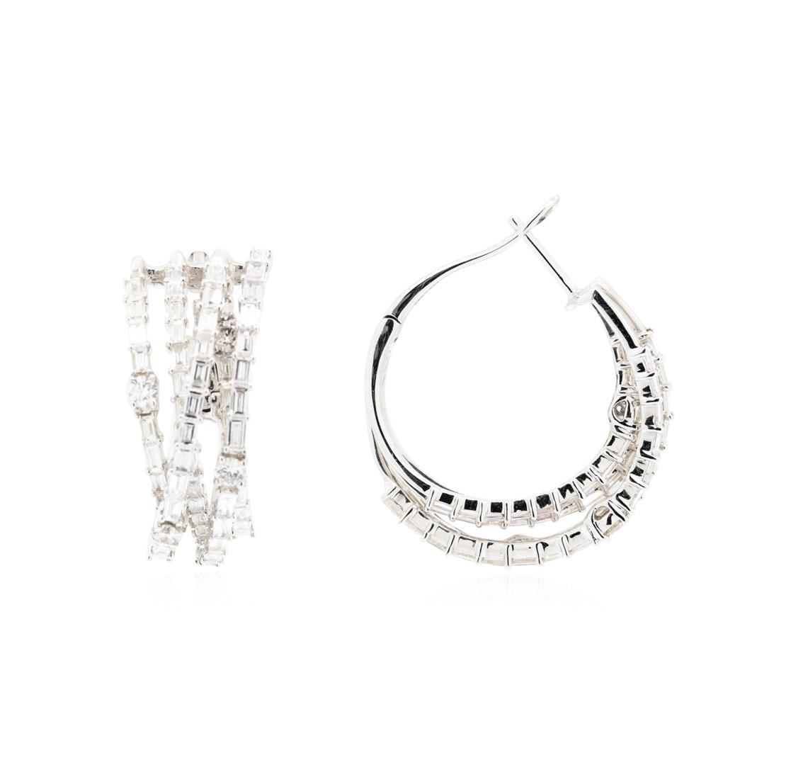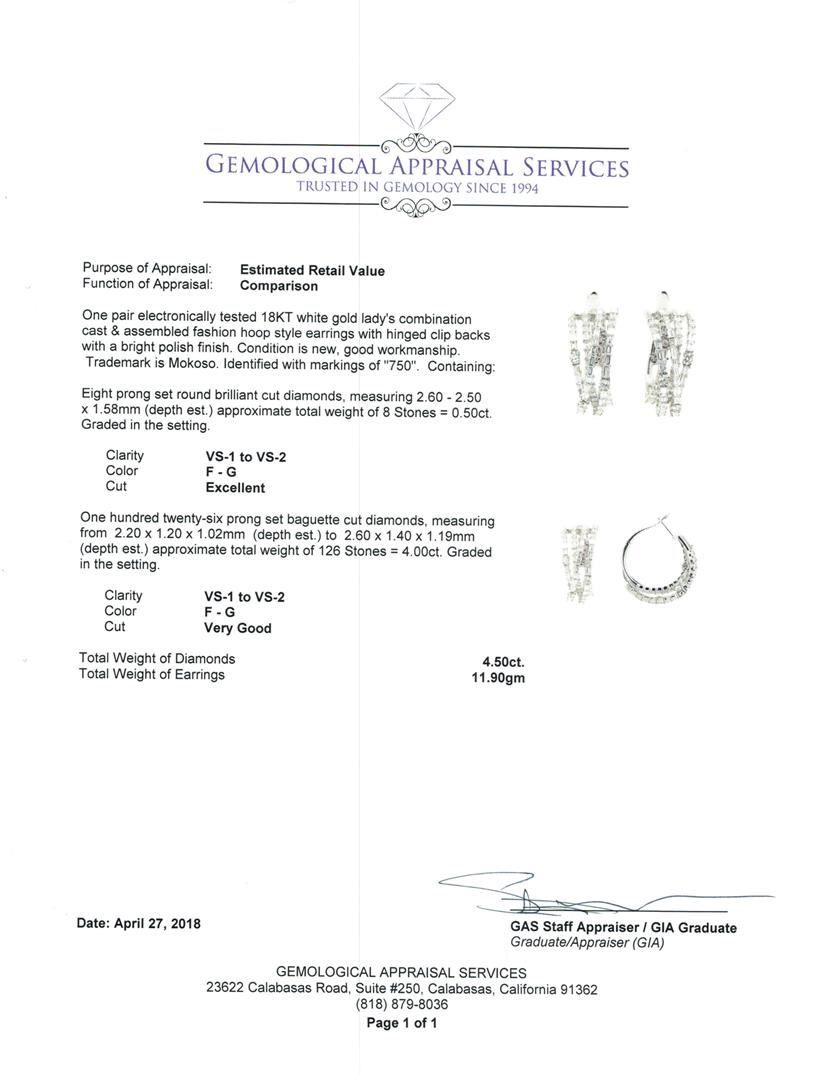 One pair electronically tested 18KT white gold Ladies combination cast & assembled fashion hoop style earrings with hinged clip backs with a bright polish finish. Trademark is Mokoso. Identified with markings of '750'. Condition is new, good workmanship. Containing: Eight prong set round brilliant cut diamonds, measuring 2.60 - 2.50 x 1.58mm (depth est.) approximate total weight of 8 Stones = 0.50ct. Graded in the setting. Color F - G Clarity VS-1 to VS-2 Cut Excellent One Hundred Twenty-Six prong set baguette cut diamonds, measuring from 2.20 x 1.20 x 1.02mm (depth est.) to 2.60 x 1.40 x 1.19mm (depth est.) approximate total weight of 126 Stones = 4.00ct. Graded in the setting. Color F - G Clarity VS-1 to VS-2 Cut Very Good. Total Weight of Diamonds 4.50ct.. Total Weight of Earrings 11.90gm. GAS Appraised.