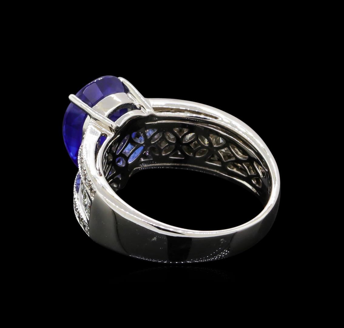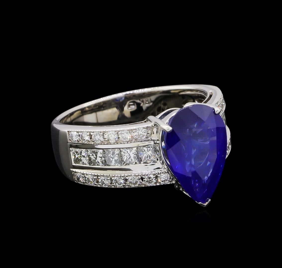 One electronically tested 18KT white gold lady's combination cast & assembled fashion ring with a three row cathedral halo with a bright polish with milgrain detailing finish. The featured lady's ring has a shank measuring 3.76 millimeters in width. Identified with markings of "18K". Condition is new, good workmanship. Containing: One prong set pear modified brilliant cut natural blue sapphire, measuring 12.40 x 8.23 x 5.50mm, (depth est.) approximate weight of 4.57ct., clarity is slightly included, medium, moderately strong, violetish blue color, (GIA vB 5/4), cut is very good. Transmitting light with a minimum of distortion, transparent. Colored gemstones are presumed to have been subjected to commonly used enhancement processes. Graded in the setting.Ten channel set princess cut diamonds, measuring 2.30 x 2.25 x 1.69mm (depth est.) approximate total weight of 10 Stones = 0.71ct. Graded in the setting. Clarity: VS-1 to VS-2. Color: H - ICut Very Good Twenty-Eight prong set round brilliant cut diamonds, measuring 1.40 - 1.30 x 0.84mm (depth est.) approximate total weight of 28 Stones = 0.28ct. Graded in the setting. Clarity: VS-2 to SI-1. Color: G - HCut Good. Total Weight of Colored Stones 4.57ct. Total Weight of Diamonds 0.99ct. Total Weight of Ring 7.50gm. GAS Appraised.