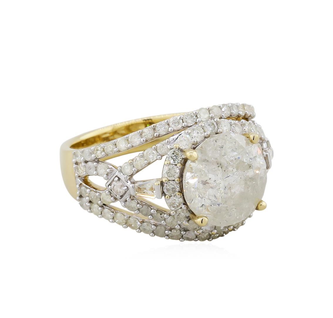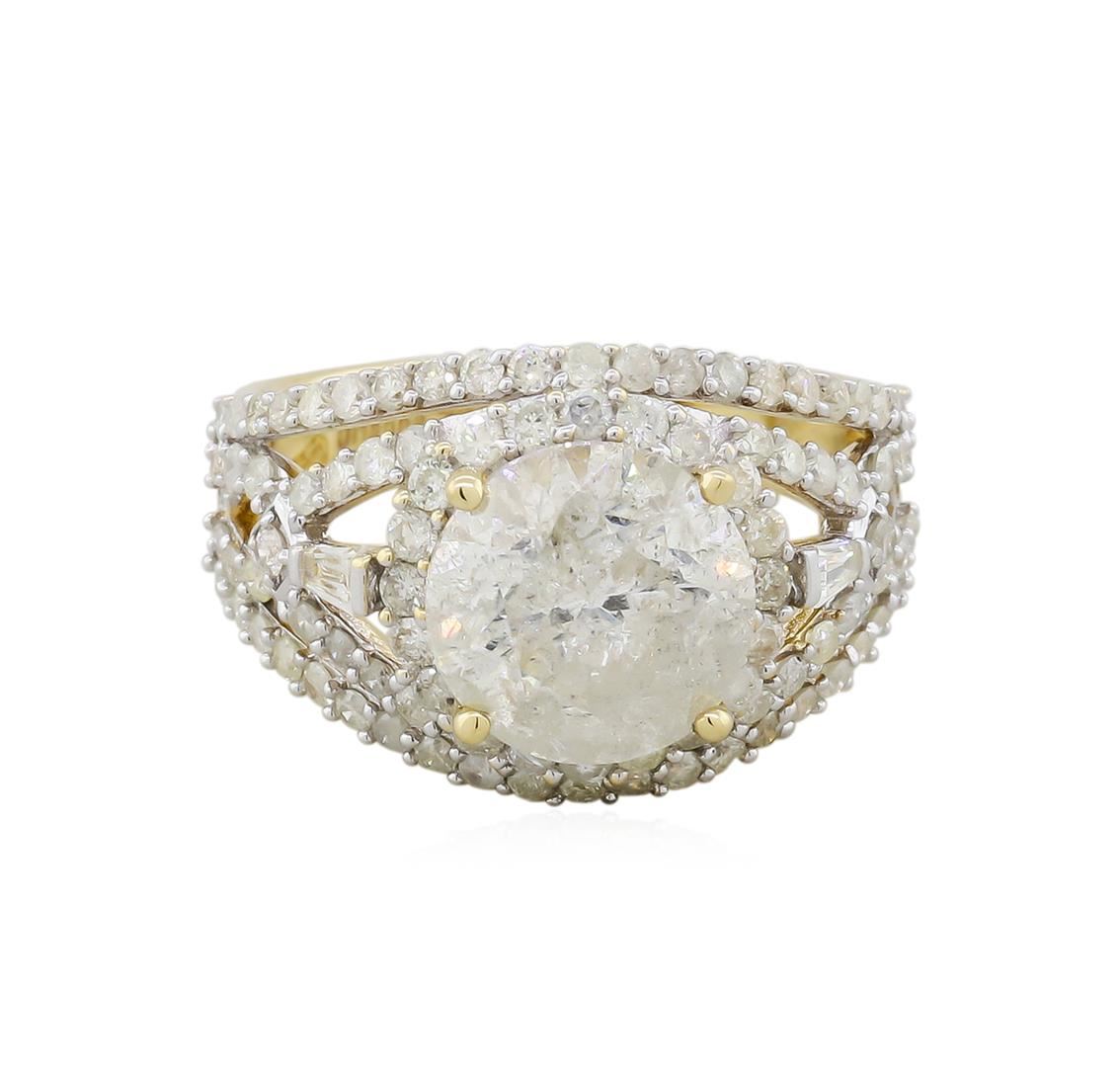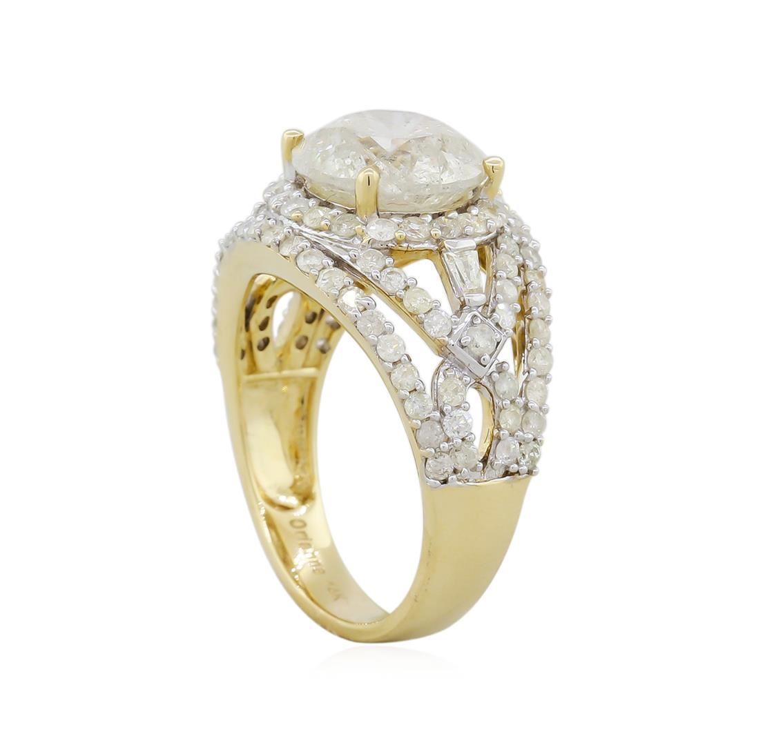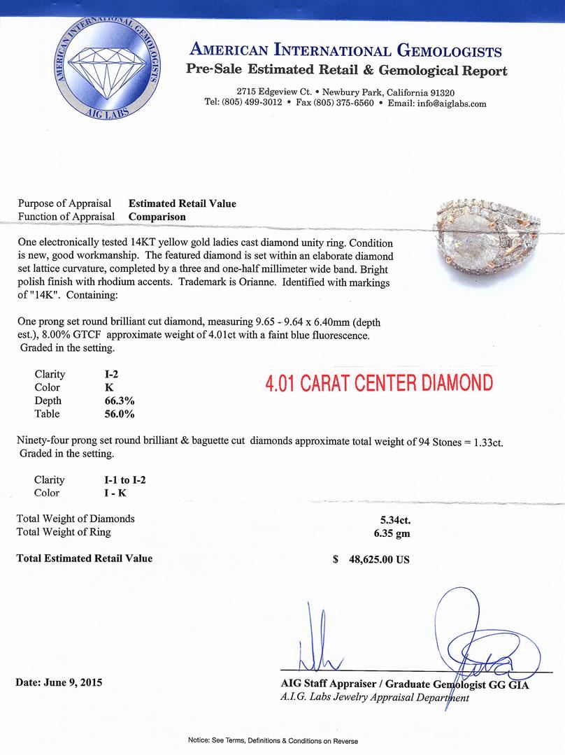 One electronically tested 14KT yellow gold ladies cast diamond unity ring. The featured diamond is set within an elaborate diamond set lattice curvature, completed by a three and one-half millimeter wide band. Bright polish finish with rhodium accents. Trademark is Orianne. Identified with markings of "14K". Condition is new, good workmanship. Containing: One prong set round brilliant cut diamond, measuring 9.65 - 9.64 x 6.40mm (depth est.), 8.00.%. GTCF approximate weight of 4.01ct with a faint blue fluorescence. Graded in the setting. Clarity: I-2. Color: KDepth 66.3%. Table 56.0%. Ninety-Four prong set round brilliant & baguette cut diamonds approximate. Total Weight of 94 Stones = 1.33ct. Graded in the setting. Clarity: I-1 to I-2. Color: I - K. Total Weight of Diamonds 5.34ct. AIG Appraised at $48,625.00.