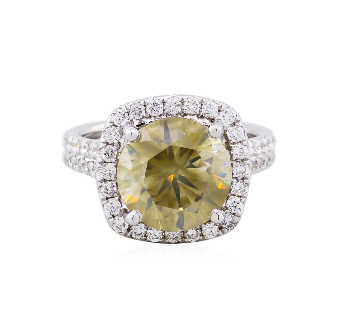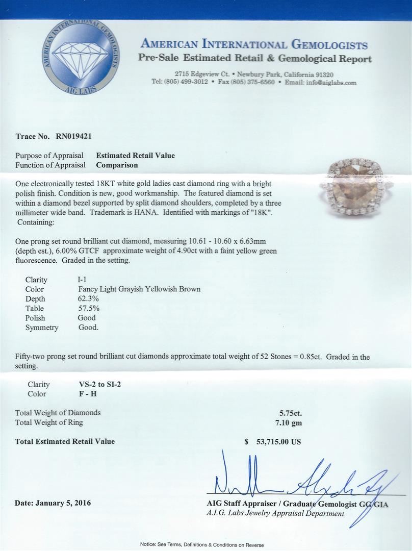 One electronically tested 18KT white gold ladies cast diamond ring with a bright polish finish. The featured diamond is set within a diamond bezel supported by split diamond shoulders, completed by a three millimeter wide band. Trademark is HANA. Identified with markings of "18K". Condition is new, good workmanship. Containing: One prong set round brilliant cut diamond, measuring 10.61 - 10.60 x 6.63mm (depth est.), 6.00.%. GTCF approximate weight of 4.90ct with a faint yellow green fluorescence. Graded in the setting. Clarity I-1. Color: Fancy Light Grayish Yellowish Brown. Depth: 62.3%. Table: 57.5%. Polish Good Symmetry Good. Fifty-Two prong set round brilliant cut diamonds approximate. Total Weight of 52 Stones = 0.85ct. Graded in the setting. Clarity: VS-2 to SI-2. Color: F - H. Total Weight of Diamonds 5.75ct. Total Weight of Ring 7.10gm. AIG Appraised at $53,715.00.