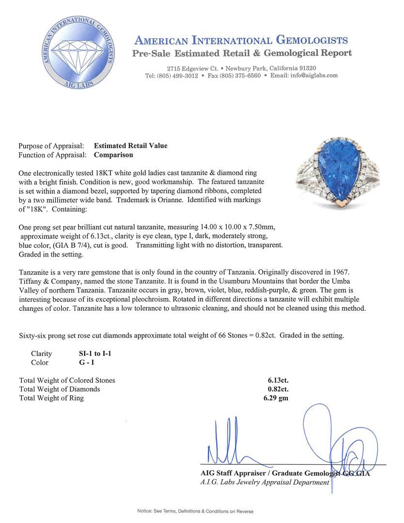 One electronically tested 18KT white gold ladies cast tanzanite & diamond ring with a bright finish. The featured tanzanite is set within a diamond bezel, supported by tapering diamond ribbons, completed by a two millimeter wide band. Trademark is Orianne. Identified with markings of "18K". Condition is new, good workmanship. Containing: One prong set pear brilliant cut natural tanzanite, measuring 14.00 x 10.00 x 7.50mm, approximate weight of 6.13ct., clarity is eye clean, type I, dark, moderately strong, blue color, (GIA B 7/4), cut is good. Transmitting light with no distortion, transparent. Graded in the setting. Tanzanite is a very rare gemstone that is only found in the country of Tanzania. Originally discovered in 1967. Tiffany & Company, named the stone Tanzanite. It is found in the Usumburu Mountains that border the Umba Valley of northern Tanzania. Tanzanite occurs in gray, brown, violet, blue, reddish-purple, & green. The gem is interesting because of its exceptional pleochroism. Rotated in different directions a tanzanite will exhibit multiple changes of color. Tanzanite has a low tolerance to ultrasonic cleaning, and should not be cleaned using this method. Sixty-Six prong set rose cut diamonds approximate total weight of 66 Stones = 0.82ct. Graded in the setting. Clarity: SI-1 to I-1. Color: G - I. Total Weight of Colored Stones 6.13ct. Total Weight of Diamonds 0.82ct. Total Weight of Ring 6.29gm. AIG Appraised.