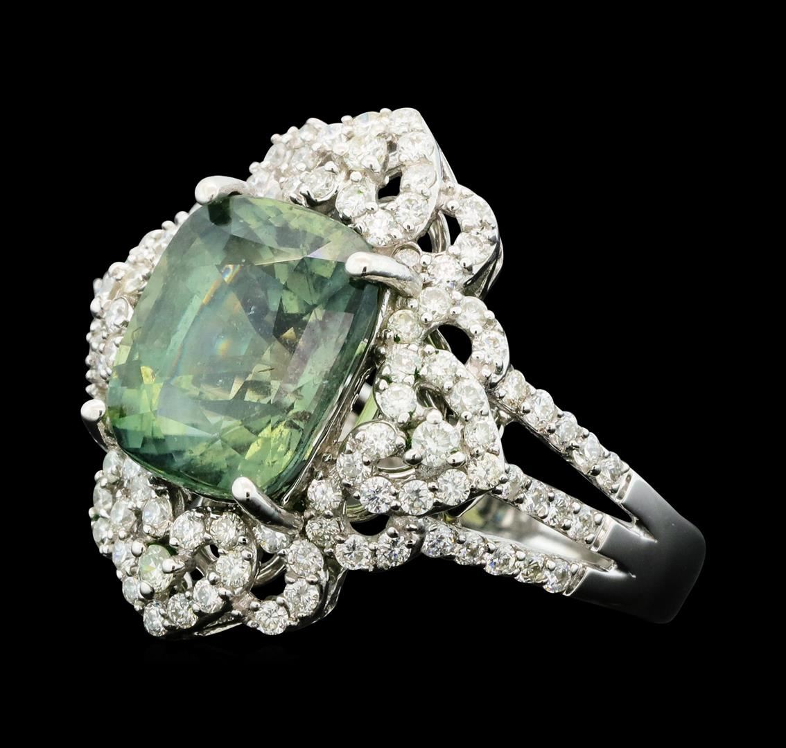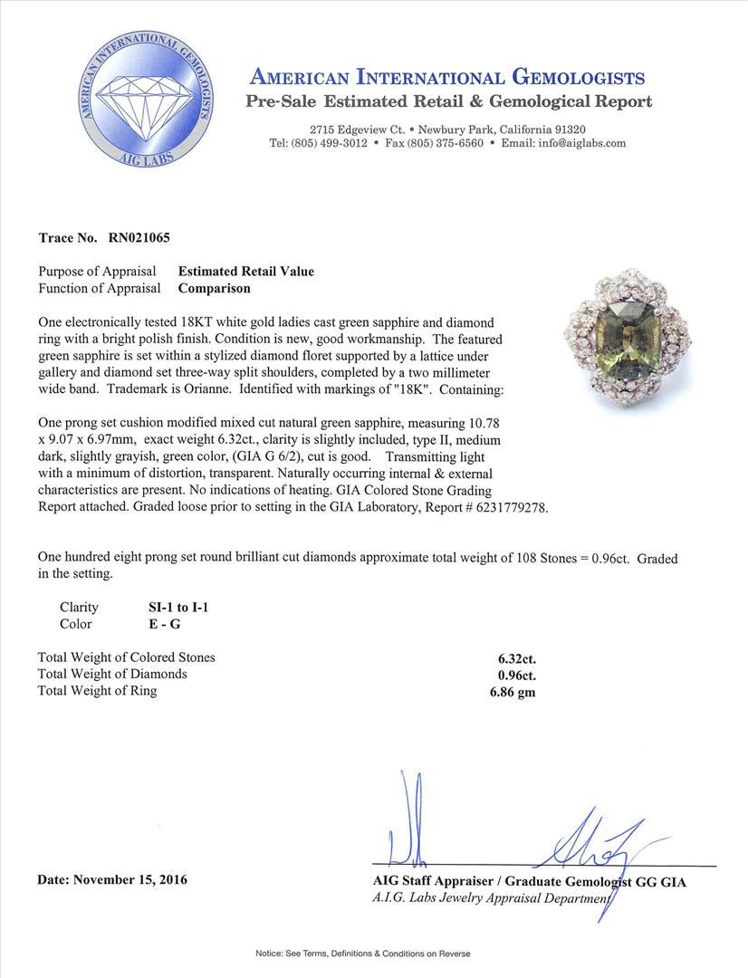 One electronically tested 18KT white gold ladies cast green sapphire and diamond ring with a bright polish finish. The featured green sapphire is set within a stylized diamond floret supported by a lattice under gallery and diamond set three-way split shoulders, completed by a two millimeter wide band. Trademark is Orianne. Identified with markings of "18K". Condition is new, good workmanship. Containing: One prong set cushion modified mixed cut natural green sapphire, measuring 10.78 x 9.07 x 6.97mm, exact weight 6.32ct., clarity is slightly included, type II, medium dark, slightly grayish, green color, (GIA G 6/2), cut is good. Transmitting light with a minimum of distortion, transparent. Naturally occurring internal & external characteristics are present. No indications of heating. GIA Colored Stone Grading Report attached. Graded loose prior to setting in the GIA Laboratory, Report # 6231779278.One Hundred Eight prong set round brilliant cut diamonds approximate total weight of 108 Stones = 0.96ct. Graded in the setting. Clarity: SI-1 to I-1. Color: E - G. Total Weight of Colored Stones 6.32ct. Total Weight of Diamonds 0.96ct. Total Weight of Ring 6.86gm. AIG Appraised.