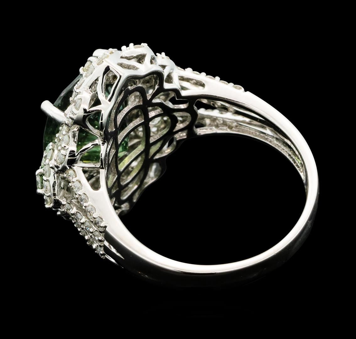 One electronically tested 18KT white gold ladies cast green sapphire and diamond ring with a bright polish finish. The featured green sapphire is set within a stylized diamond floret supported by a lattice under gallery and diamond set three-way split shoulders, completed by a two millimeter wide band. Trademark is Orianne. Identified with markings of "18K". Condition is new, good workmanship. Containing: One prong set cushion modified mixed cut natural green sapphire, measuring 10.78 x 9.07 x 6.97mm, exact weight 6.32ct., clarity is slightly included, type II, medium dark, slightly grayish, green color, (GIA G 6/2), cut is good. Transmitting light with a minimum of distortion, transparent. Naturally occurring internal & external characteristics are present. No indications of heating. GIA Colored Stone Grading Report attached. Graded loose prior to setting in the GIA Laboratory, Report # 6231779278.One Hundred Eight prong set round brilliant cut diamonds approximate total weight of 108 Stones = 0.96ct. Graded in the setting. Clarity: SI-1 to I-1. Color: E - G. Total Weight of Colored Stones 6.32ct. Total Weight of Diamonds 0.96ct. Total Weight of Ring 6.86gm. AIG Appraised.