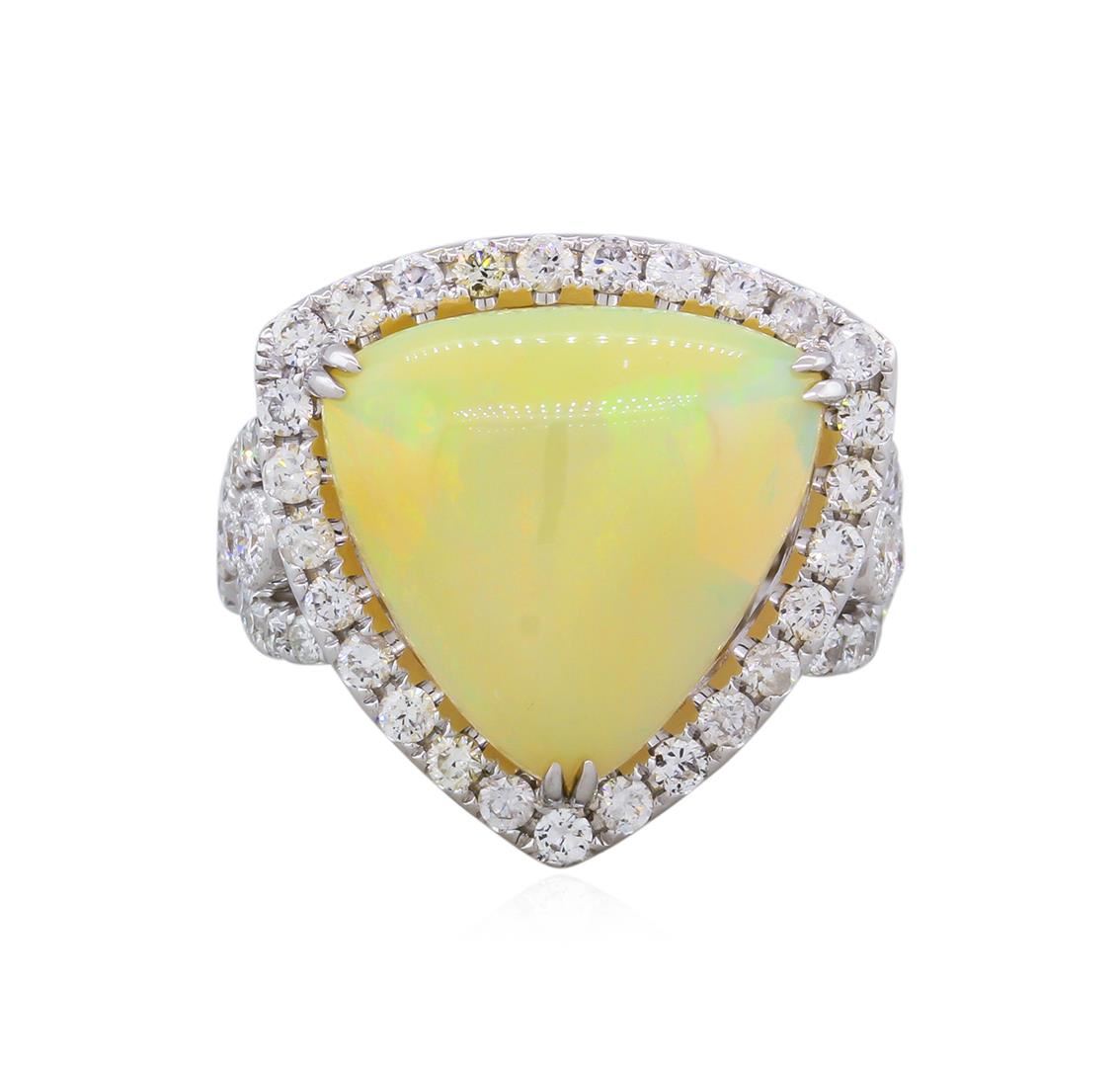 One elegant opal and diamond ring set in 18KT white gold weighing 7.80 grams containing a 6.63 carat opal center stone beautifully showcased by sixty-five round diamonds which extend down both sides of the band and weigh in collectively at 1.22 carats.