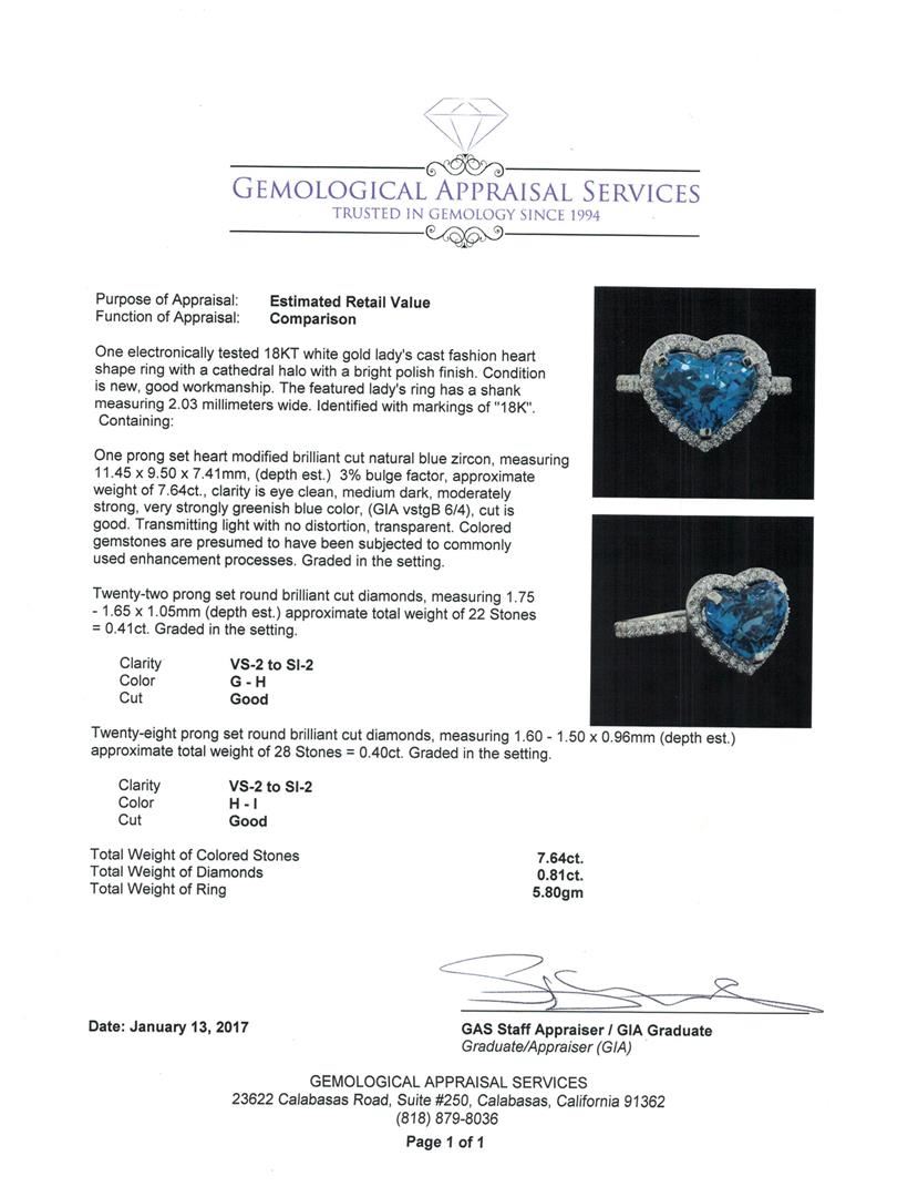 One electronically tested 18KT white gold lady's cast fashion heart shape ring with a cathedral halo with a bright polish finish. The featured lady's ring has a shank measuring 2.03 millimeters wide. Identified with markings of "18K". Condition is new, good workmanship. Containing: One prong set heart modified brilliant cut natural blue zircon, measuring 11.45 x 9.50 x 7.41mm, (depth est.) 3%. bulge factor, approximate weight of 7.64ct., clarity is eye clean, medium dark, moderately strong, very strongly greenish blue color, (GIA vstgB 6/4), cut is good. Transmitting light with no distortion, transparent. Colored gemstones are presumed to have been subjected to commonly used enhancement processes. Graded in the setting. Twenty-Two prong set round brilliant cut diamonds, measuring 1.75 - 1.65 x 1.05mm (depth est.) approximate total weight of 22 Stones = 0.41ct. Graded in the setting. Clarity: VS-2 to SI-2. Color: G - HCut Good Twenty-Eight prong set round brilliant cut diamonds, measuring 1.60 - 1.50 x 0.96mm (depth est.) approximate total weight of 28 Stones = 0.40ct. Graded in the setting. Clarity: VS-2 to SI-2. Color: H - ICut Good. Total Weight of Colored Stones 7.64ct. Total Weight of Diamonds 0.81ct. Total Weight of Ring 5.80gm. GAS Appraised.