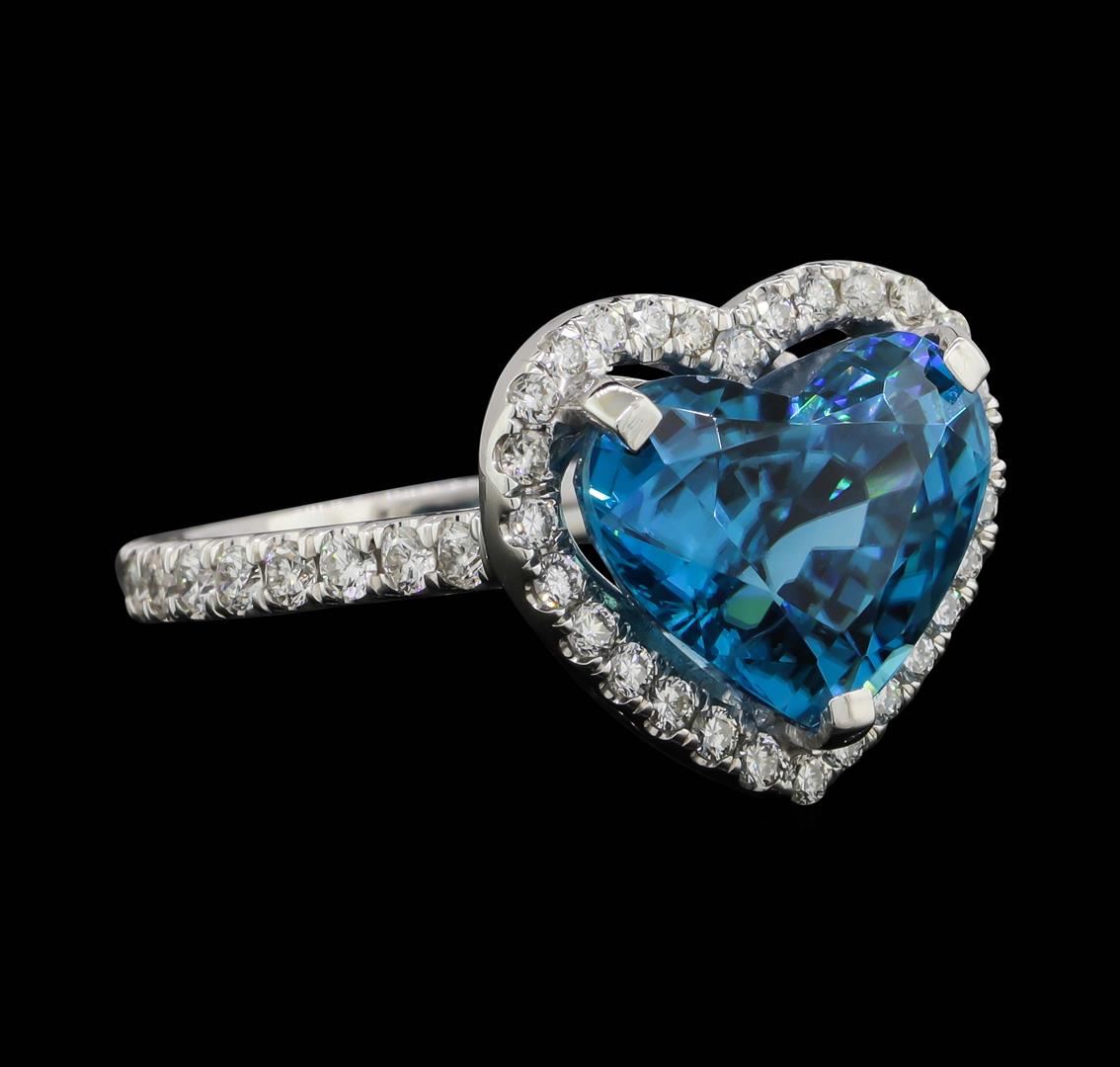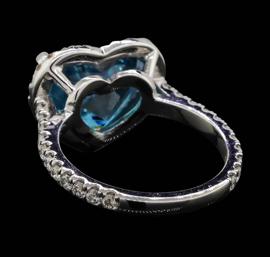 One electronically tested 18KT white gold lady's cast fashion heart shape ring with a cathedral halo with a bright polish finish. The featured lady's ring has a shank measuring 2.03 millimeters wide. Identified with markings of "18K". Condition is new, good workmanship. Containing: One prong set heart modified brilliant cut natural blue zircon, measuring 11.45 x 9.50 x 7.41mm, (depth est.) 3%. bulge factor, approximate weight of 7.64ct., clarity is eye clean, medium dark, moderately strong, very strongly greenish blue color, (GIA vstgB 6/4), cut is good. Transmitting light with no distortion, transparent. Colored gemstones are presumed to have been subjected to commonly used enhancement processes. Graded in the setting. Twenty-Two prong set round brilliant cut diamonds, measuring 1.75 - 1.65 x 1.05mm (depth est.) approximate total weight of 22 Stones = 0.41ct. Graded in the setting. Clarity: VS-2 to SI-2. Color: G - HCut Good Twenty-Eight prong set round brilliant cut diamonds, measuring 1.60 - 1.50 x 0.96mm (depth est.) approximate total weight of 28 Stones = 0.40ct. Graded in the setting. Clarity: VS-2 to SI-2. Color: H - ICut Good. Total Weight of Colored Stones 7.64ct. Total Weight of Diamonds 0.81ct. Total Weight of Ring 5.80gm. GAS Appraised.