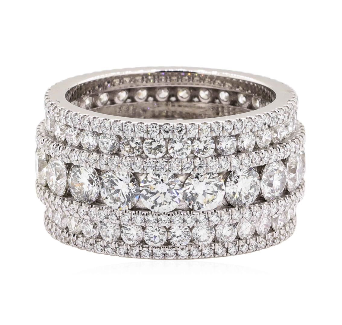One electronically tested 18KT white gold Ladies cast wedding band with a bright polish finish. The featured Ladies ring is a size 9.5 and has a shank measuring 12.85 millimeters wide. Identified with markings of '18K'. Condition is new, good workmanship. Containing: Nineteen channel set round brilliant cut diamonds, measuring 4.00 - 3.90 x 2.45mm (depth est.) approximate total weight of 19 Stones = 4.50ct. Graded in the setting. Color H - I Clarity VS-2 to SI-1 Cut Very Good Sixty-Four channel set round brilliant cut diamonds, measuring 2.20 - 2.10 x 1.33mm (depth est.) approximate total weight of 64 Stones = 2.40ct. Graded in the setting. Color H - I Clarity VS-1 to SI-1 Cut Very Good Two Hundred Fifty-Two prong set round brilliant cut diamonds, measuring 1.10 - 1.00 x 0.65mm (depth est.) approximate total weight of 252 Stones = 1.10ct. Graded in the setting. Color G - I Clarity VS-2 to SI-1 Cut Very Good. Total Weight of Diamonds 8.00ct.. Total Weight of Band 14.10gm. GAS Appraised.