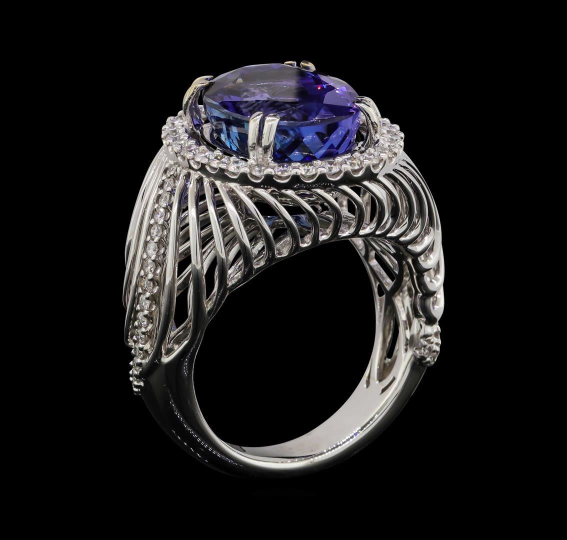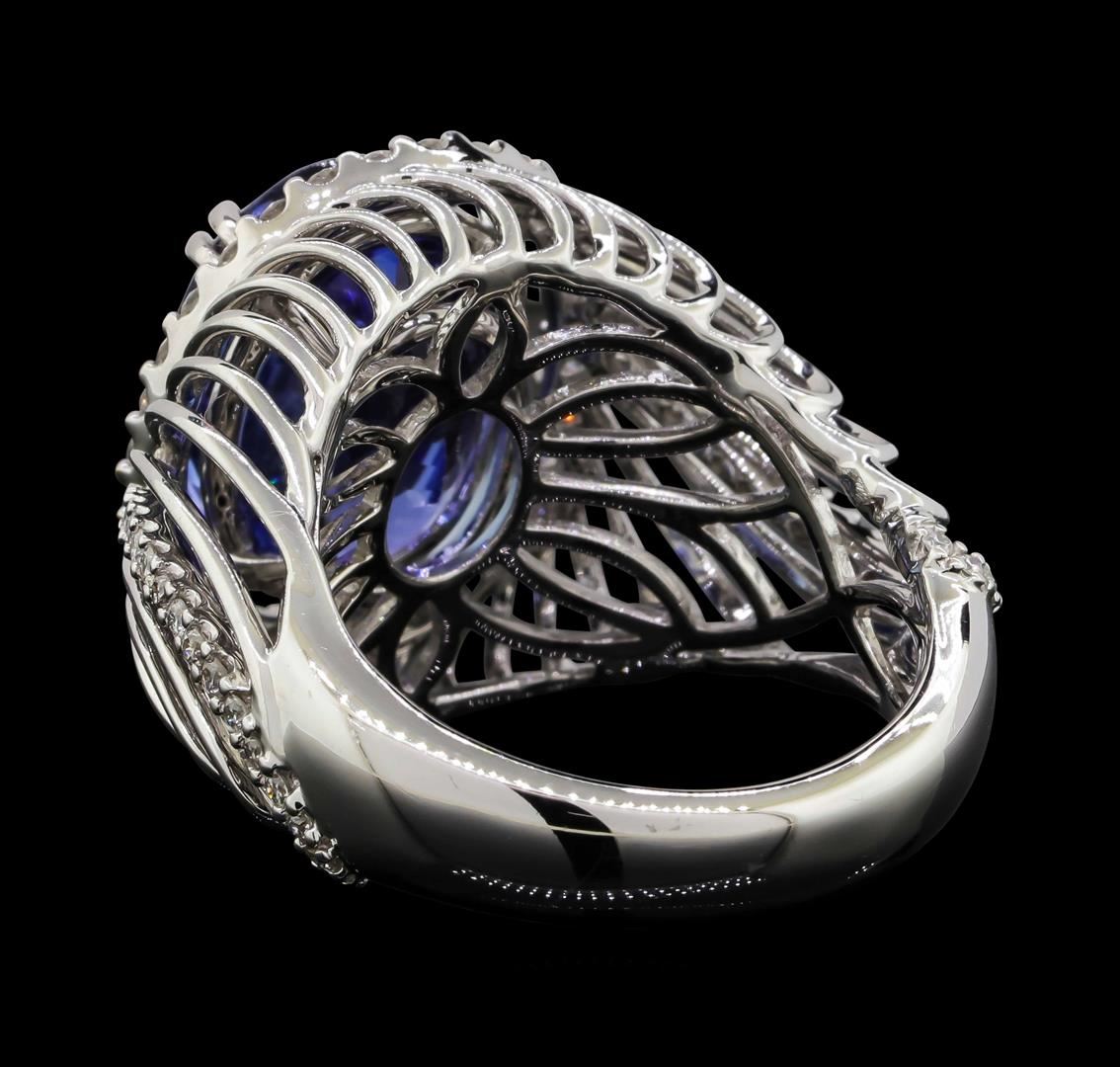One electronically tested 18KT white gold lady's cast fashion ring with a tapered cathedral shank with a bright polish finish. The featured lady's ring has a scalloped wire-frame dome motif and a shank measuring 4.25 millimeters wide. Identified with markings of "18K". Condition is new, good workmanship. Containing: One prong set oval modified brilliant cut natural tanzanite, measuring 13.14 x 10.02 x 7.96mm, (depth est.) 10%. bulge factor, approximate weight of 8.01ct., clarity is eye clean, medium dark, very slightly grayish, violetish blue color, (GIA vB 6/3), cut is very good. Transmitting light with no distortion, transparent. Colored gemstones are presumed to have been subjected to commonly used enhancement processes. Graded in the setting. Thirty prong set round brilliant cut diamonds, measuring 1.50 - 1.40 x 0.90mm (depth est.) approximate total weight of 30 Stones = 0.35ct. Graded in the setting. Clarity: SI-1 to SI-2. Color: H - ICut Good Thirty-Six prong set round brilliant cut diamonds, measuring 1.30 - 1.20 x 0.75mm (depth est.) approximate total weight of 36 Stones = 0.21ct. Graded in the setting. Clarity: SI-1 to SI-2. Color: H - ICut Good. Total Weight of Colored Stones 8.01ct. Total Weight of Diamonds 0.56ct. Total Weight of Ring 11.20gm GAS Appraised.