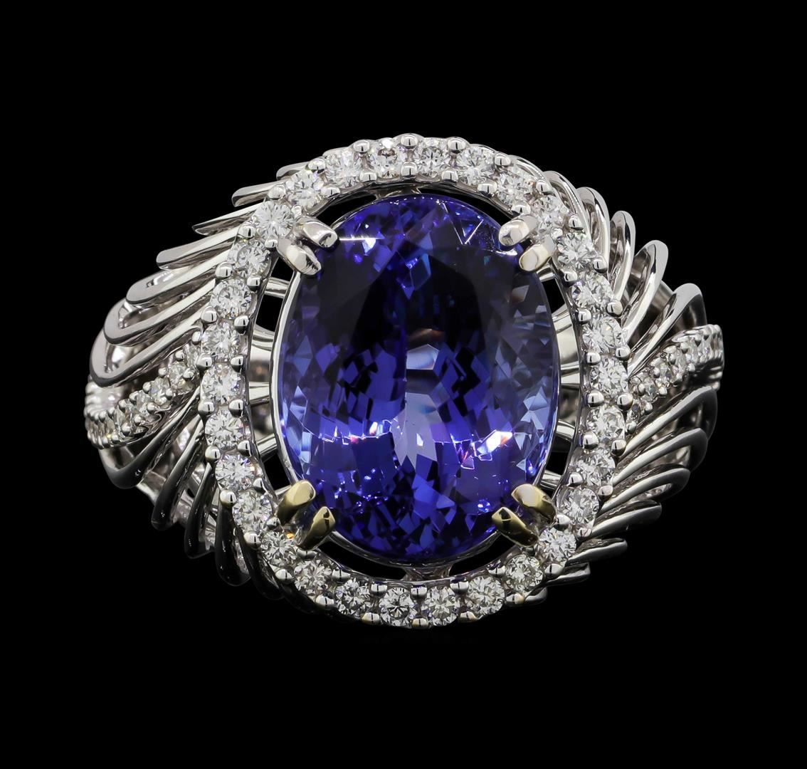 One electronically tested 18KT white gold lady's cast fashion ring with a tapered cathedral shank with a bright polish finish. The featured lady's ring has a scalloped wire-frame dome motif and a shank measuring 4.25 millimeters wide. Identified with markings of "18K". Condition is new, good workmanship. Containing: One prong set oval modified brilliant cut natural tanzanite, measuring 13.14 x 10.02 x 7.96mm, (depth est.) 10%. bulge factor, approximate weight of 8.01ct., clarity is eye clean, medium dark, very slightly grayish, violetish blue color, (GIA vB 6/3), cut is very good. Transmitting light with no distortion, transparent. Colored gemstones are presumed to have been subjected to commonly used enhancement processes. Graded in the setting. Thirty prong set round brilliant cut diamonds, measuring 1.50 - 1.40 x 0.90mm (depth est.) approximate total weight of 30 Stones = 0.35ct. Graded in the setting. Clarity: SI-1 to SI-2. Color: H - ICut Good Thirty-Six prong set round brilliant cut diamonds, measuring 1.30 - 1.20 x 0.75mm (depth est.) approximate total weight of 36 Stones = 0.21ct. Graded in the setting. Clarity: SI-1 to SI-2. Color: H - ICut Good. Total Weight of Colored Stones 8.01ct. Total Weight of Diamonds 0.56ct. Total Weight of Ring 11.20gm GAS Appraised.