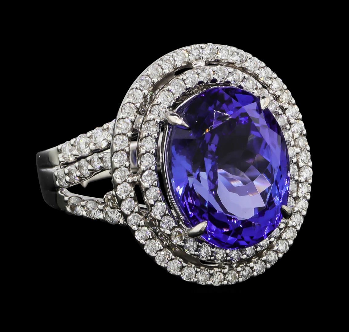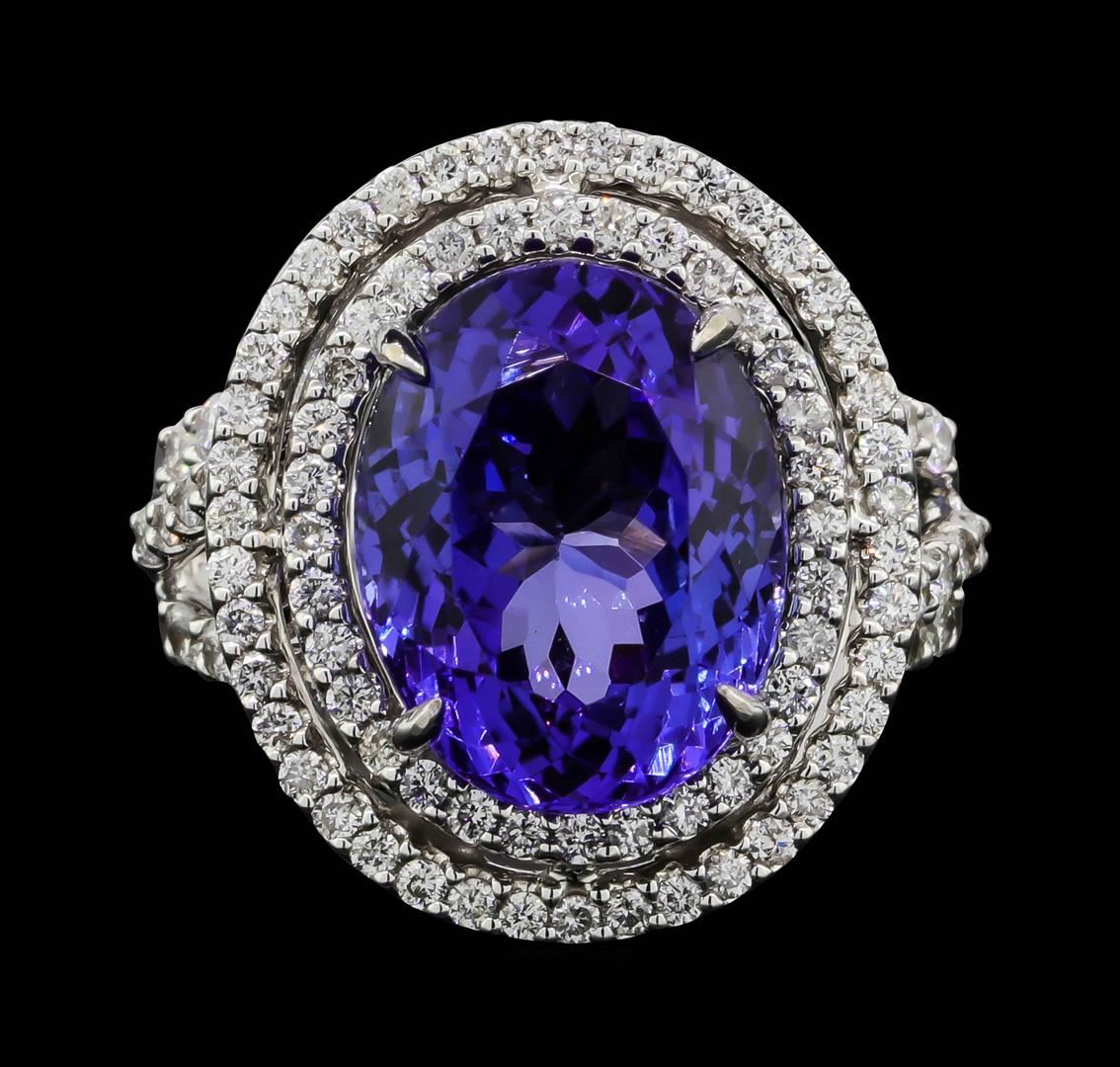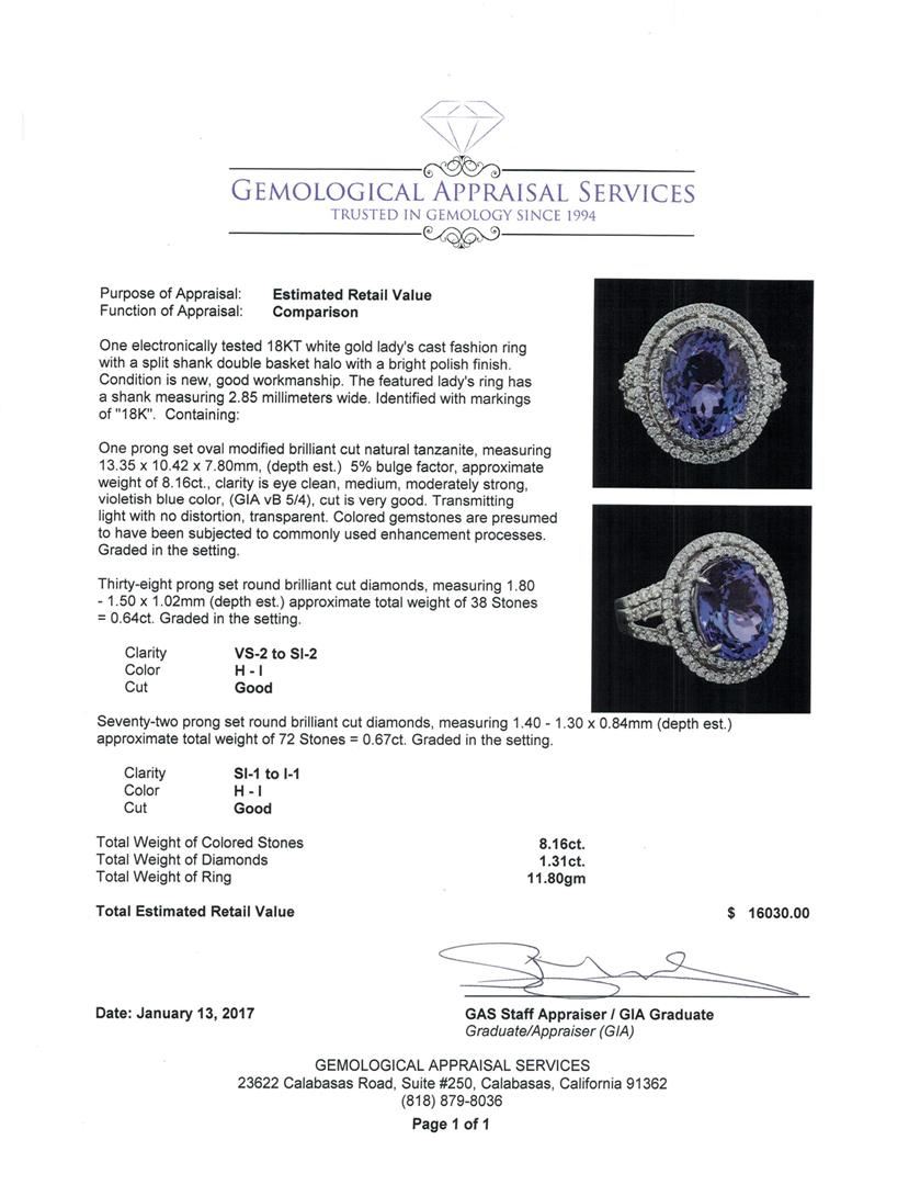One electronically tested 18KT white gold lady's cast fashion ring with a split shank double basket halo with a bright polish finish. The featured lady's ring has a shank measuring 2.85 millimeters wide. Identified with markings of "18K". Condition is new, good workmanship. Containing: One prong set oval modified brilliant cut natural tanzanite, measuring 13.35 x 10.42 x 7.80mm, (depth est.) 5%. bulge factor, approximate weight of 8.16ct., clarity is eye clean, medium, moderately strong, violetish blue color, (GIA vB 5/4), cut is very good. Transmitting light with no distortion, transparent. Colored gemstones are presumed to have been subjected to commonly used enhancement processes. Graded in the setting. Thirty-Eight prong set round brilliant cut diamonds, measuring 1.80 - 1.50 x 1.02mm (depth est.) approximate total weight of 38 Stones = 0.64ct. Graded in the setting. Clarity: VS-2 to SI-2. Color: H - ICut Good Seventy-Two prong set round brilliant cut diamonds, measuring 1.40 - 1.30 x 0.84mm (depth est.) approximate total weight of 72 Stones = 0.67ct. Graded in the setting. Clarity: SI-1 to I-1. Color: H - ICut Good. Total Weight of Colored Stones 8.16ct. Total Weight of Diamonds 1.31ct. Total Weight of Ring 11.80gm. GAS Appraised at $16,030.00.