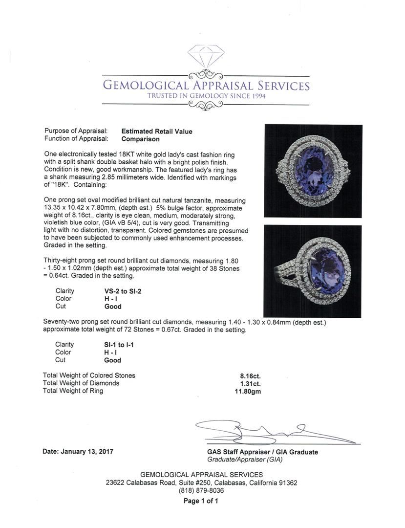 One electronically tested 18KT white gold lady's cast fashion ring with a split shank double basket halo with a bright polish finish. The featured lady's ring has a shank measuring 2.85 millimeters wide. Identified with markings of "18K". Condition is new, good workmanship. Containing: One prong set oval modified brilliant cut natural tanzanite, measuring 13.35 x 10.42 x 7.80mm, (depth est.) 5%. bulge factor, approximate weight of 8.16ct., clarity is eye clean, medium, moderately strong, violetish blue color, (GIA vB 5/4), cut is very good. Transmitting light with no distortion, transparent. Colored gemstones are presumed to have been subjected to commonly used enhancement processes. Graded in the setting. Thirty-Eight prong set round brilliant cut diamonds, measuring 1.80 - 1.50 x 1.02mm (depth est.) approximate total weight of 38 Stones = 0.64ct. Graded in the setting. Clarity: VS-2 to SI-2. Color: H - ICut Good Seventy-Two prong set round brilliant cut diamonds, measuring 1.40 - 1.30 x 0.84mm (depth est.) approximate total weight of 72 Stones = 0.67ct. Graded in the setting. Clarity: SI-1 to I-1. Color: H - ICut Good. Total Weight of Colored Stones 8.16ct. Total Weight of Diamonds 1.31ct. Total Weight of Ring 11.80gm. GAS Appraised.