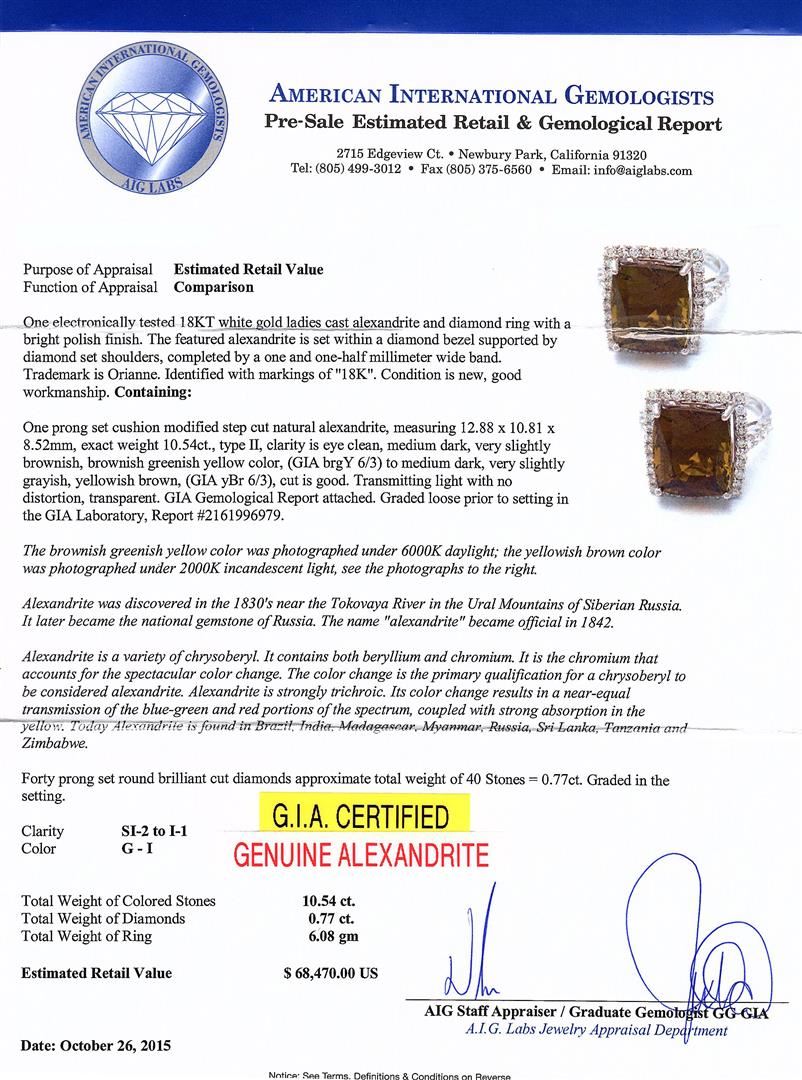 One electronically tested 18KT white gold ladies cast alexandrite and diamond ring with a bright polish finish. The featured alexandrite is set within a diamond bezel supported by diamond set shoulders, completed by a one and one-half millimeter wide band. Trademark is Orianne. Identified with markings of "18K". Condition is new, good workmanship. Containing: One prong set cushion modified step cut natural alexandrite, measuring 12.88 x 10.81 x 8.52mm, exact weight 10.54ct., type Il, clarity is eye clean, medium dark, very slightly brownish, brownish greenish yellow color, (GIA brgY 6/3) to medium dark, very slightly grayish, yellowish brown, (GIA yBr 6/3), cut is good. Transmitting light with no distortion, transparent. GIA Gemological Report attached. Graded loose prior to setting in the GIA Laboratory, Report #2161996979. Alexandrite was discovered in the 1830's near the Tokovaya River in the Ural Mountains of Siberian Russia. It later became the national gemstone of Russia. The name "alexandrite" became official in 1842. Alexandrite is a variety of chrysoberyl. It contains both beryllium and chromium It is the chromium that accounts for the spectacular color change. The color change is the primary qualification for a chrysoberyl to be considered alexandrite. Alexandrite is strongly trichroic. Its color change results in a near-equal transmission of the blue-green and red portions of the spectrum, coupled with strong absorption in the yellow. Today Alexandrite is found in Brazil, India, Madagascar, Myanmar, Russia, Sri Lanka, Tanzania and Zimbabwe. Forty prong set round brilliant cut diamonds approximate total weight of 40 Stones 0.77ct. Graded in the setting. Clarity SI-2 to I-1. Color G-I. Total Weight of Alexandrite is 10.54ct. Total Weight of Diamonds 0.77cts. Total Weight of Ring is 6.08 grams. AIG Appraised at $68,470.00.