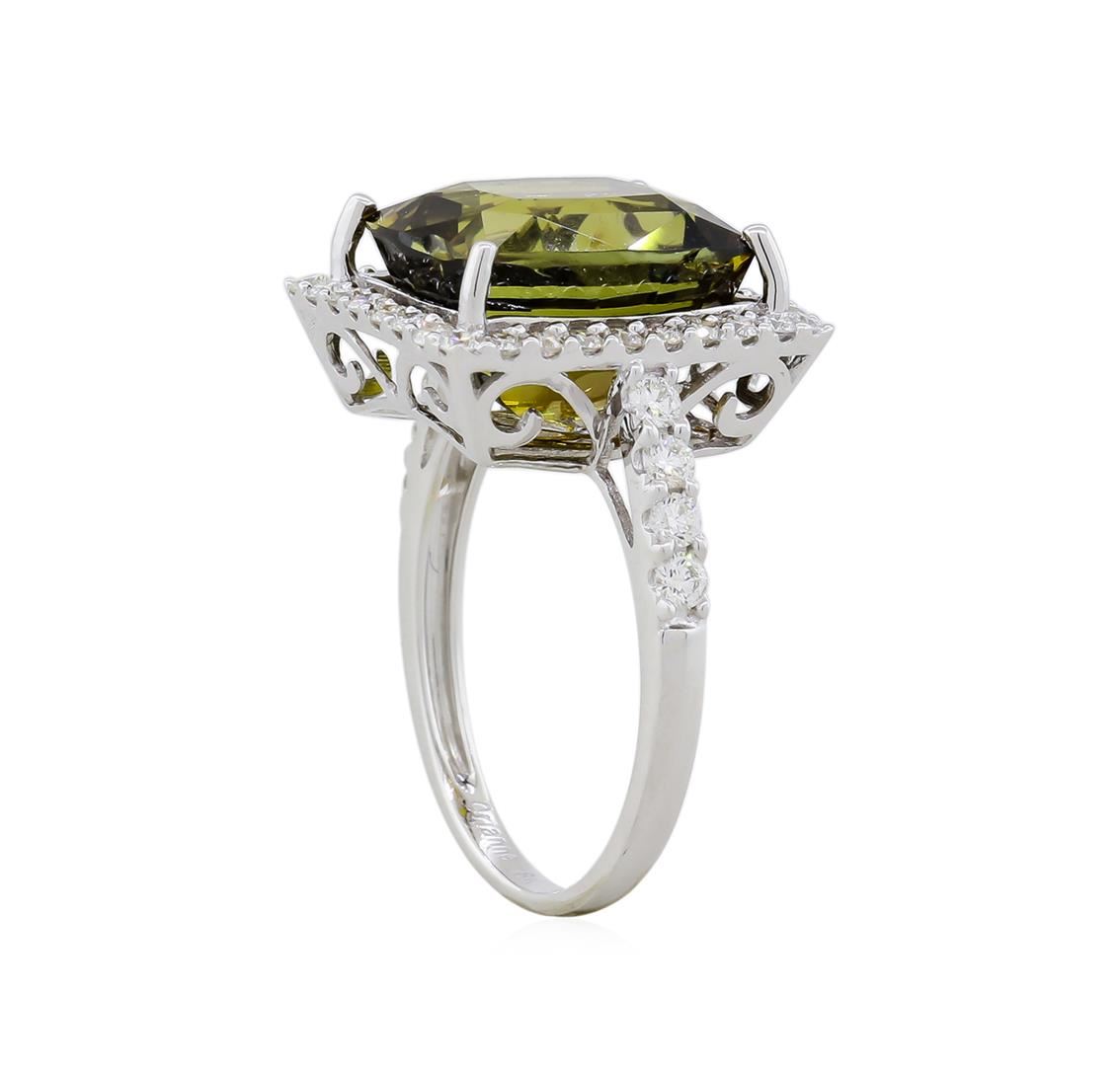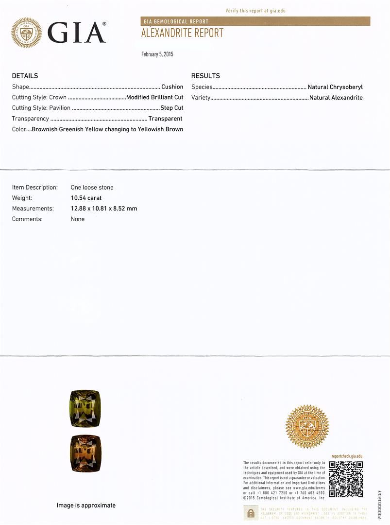 One electronically tested 18KT white gold ladies cast alexandrite and diamond ring with a bright polish finish. The featured alexandrite is set within a diamond bezel supported by diamond set shoulders, completed by a one and one-half millimeter wide band. Trademark is Orianne. Identified with markings of "18K". Condition is new, good workmanship. Containing: One prong set cushion modified step cut natural alexandrite, measuring 12.88 x 10.81 x 8.52mm, exact weight 10.54ct., type Il, clarity is eye clean, medium dark, very slightly brownish, brownish greenish yellow color, (GIA brgY 6/3) to medium dark, very slightly grayish, yellowish brown, (GIA yBr 6/3), cut is good. Transmitting light with no distortion, transparent. GIA Gemological Report attached. Graded loose prior to setting in the GIA Laboratory, Report #2161996979. Alexandrite was discovered in the 1830's near the Tokovaya River in the Ural Mountains of Siberian Russia. It later became the national gemstone of Russia. The name "alexandrite" became official in 1842. Alexandrite is a variety of chrysoberyl. It contains both beryllium and chromium It is the chromium that accounts for the spectacular color change. The color change is the primary qualification for a chrysoberyl to be considered alexandrite. Alexandrite is strongly trichroic. Its color change results in a near-equal transmission of the blue-green and red portions of the spectrum, coupled with strong absorption in the yellow. Today Alexandrite is found in Brazil, India, Madagascar, Myanmar, Russia, Sri Lanka, Tanzania and Zimbabwe. Forty prong set round brilliant cut diamonds approximate total weight of 40 Stones 0.77ct. Graded in the setting. Clarity SI-2 to I-1. Color G-I. Total Weight of Alexandrite is 10.54ct. Total Weight of Diamonds 0.77cts. Total Weight of Ring is 6.08 grams. AIG Appraised at $68,470.00.
