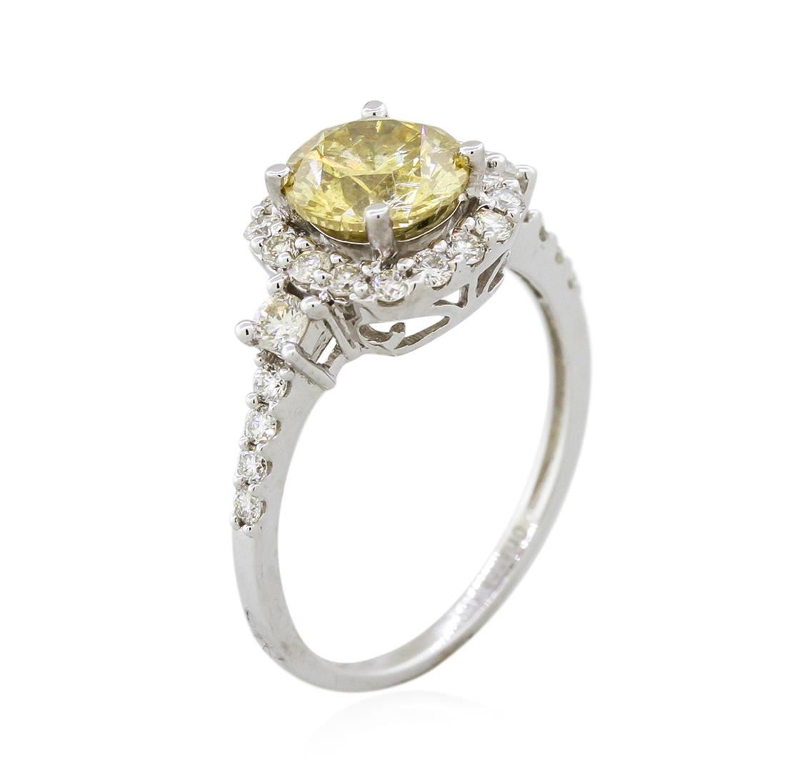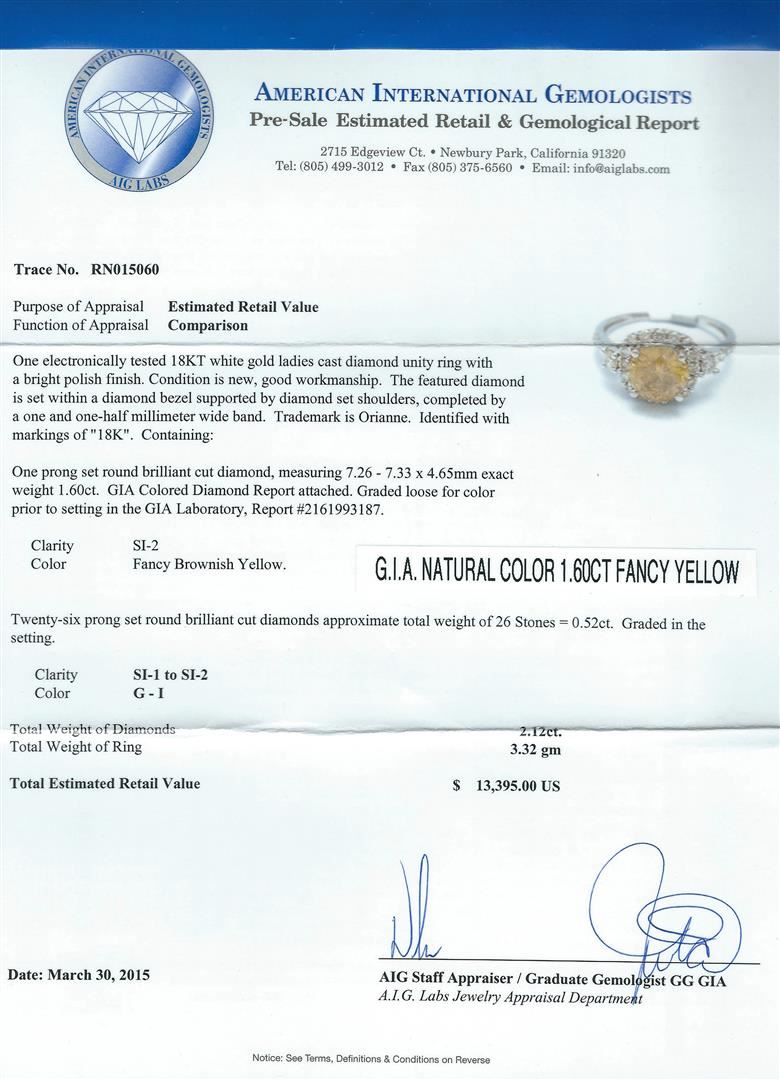 One electronically tested 18KT white gold ladies cast diamond unity ring with bright polish finish. Condition is new, good workmanship. The featured diamond is set within a diamond bezel supported by diamond shoulders, completed by a one and one-half milimeter wide band. Trademark is Orianne. Identified with markings of "18K". Containing: one prong set round brilliant cut diamond, measuring 7.26 - 7.33 x 4.65mm exact weight 1.60ct. GIA colored diamond report attached. Graded loose for color prior to setting in the GIA labratory, Report #2161993187. Graded in setting. Carlity SI-2, color Fancy brownish yellow. Twenty-six prong set round brilliant cut diamonds approximate total weight of 26 stones = 0.52ct. Graded in the setting. AIG Appraised at $13,395.00.
