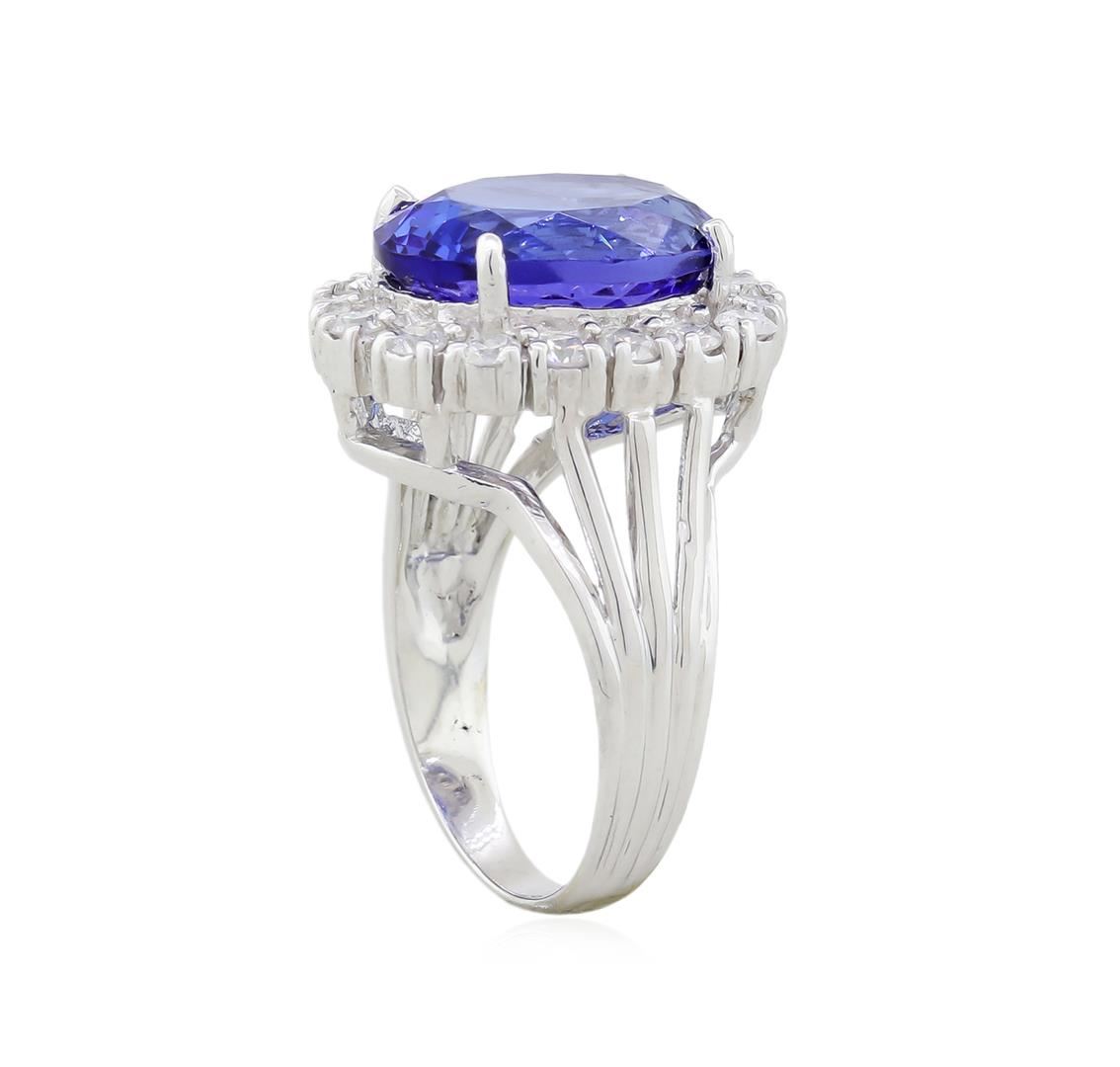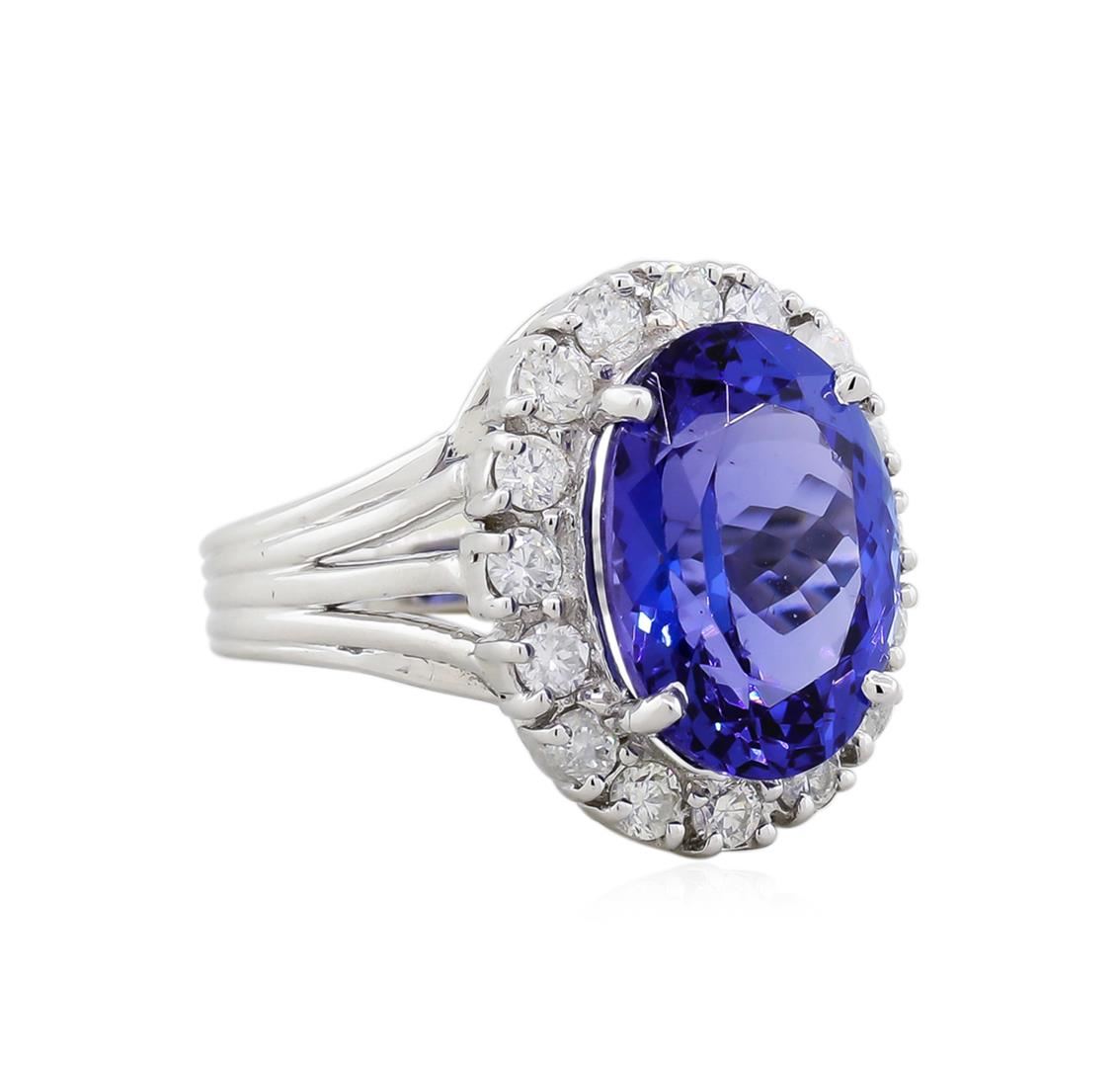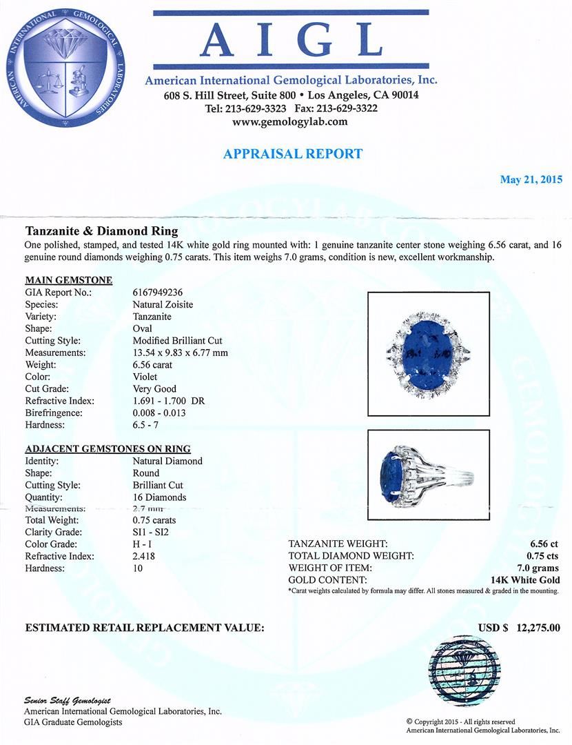 One polished, stamped and tested 14KT white gold ring mounted with: 1 genuine oval modified brilliant cut tanzanite center stone weighing 6.56 carats, and 16 genuine brilliant cut round diamonds weighing 0.75 carats. The centerstone measures 13.54 x 9.83 x 6.77mm. Color is violet. Clarity of 16 accent diamonds range from SI1-SI2. This item weighs 7.0 grams, condition is new and workmanship is excellent. GIA Appraised.