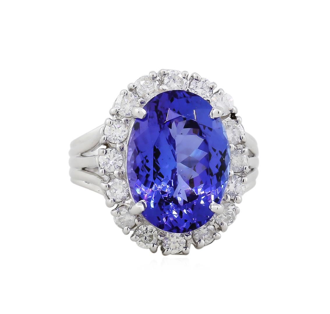 One polished, stamped and tested 14KT white gold ring mounted with: 1 genuine oval modified brilliant cut tanzanite center stone weighing 6.56 carats, and 16 genuine brilliant cut round diamonds weighing 0.75 carats. The centerstone measures 13.54 x 9.83 x 6.77mm. Color is violet. Clarity of 16 accent diamonds range from SI1-SI2. This item weighs 7.0 grams, condition is new and workmanship is excellent. GIA Appraised.