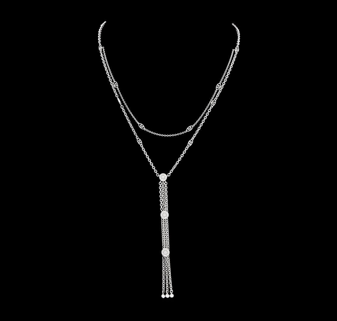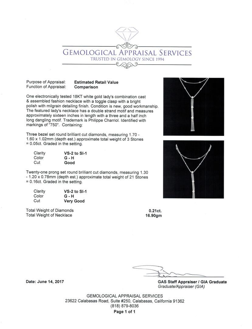 One electronically tested 18KT white gold lady's combination cast & assembled fashion necklace with a toggle clasp with a bright polish with milgrain detailing finish. The featured lady's necklace has a double strand motif and measures approximately sixteen inches in length with a three and a half inch long dangling motif. Trademark is Philippe Charriol. Identified with markings of '750'. Condition is new, good workmanship. Containing: Three bezel set round brilliant cut diamonds, measuring 1.70 - 1.60 x 1.02mm (depth est.) approximate total weight of 3 Stones = 0.05ct. Graded in the setting. Color G - H Clarity VS-2 to SI-1 Cut Good Twenty-One prong set round brilliant cut diamonds, measuring 1.30 - 1.20 x 0.78mm (depth est.) approximate total weight of 21 Stones = 0.16ct. Graded in the setting. Color G - H Clarity VS-2 to SI-1 Cut Very Good. Total Weight of Diamonds 0.21ct.. Total Weight of Necklace 16.90gm GAS Appraised.