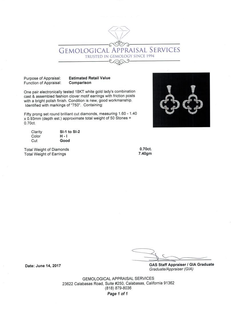 One pair electronically tested 18KT white gold lady's combination cast & assembled fashion clover motif earrings with friction posts with a bright polish finish. Identified with markings of '750'. Condition is new, good workmanship. Containing: Fifty prong set round brilliant cut diamonds, measuring 1.60 - 1.40 x 0.93mm (depth est.) approximate total weight of 50 Stones = 0.70ct. Color H - I Clarity SI-1 to SI-2 Cut Good. Total Weight of Diamonds 0.70ct.. Total Weight of Earrings 7.40gm GAS Appraised.