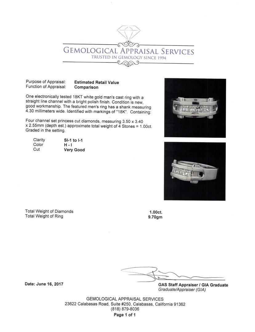 One electronically tested 18KT white gold man's cast ring with a straight line channel with a bright polish finish. The featured men's ring has a shank measuring 4.30 millimeters wide. Identified with markings of '18K'. Condition is new, good workmanship. Containing: Four channel set princess cut diamonds, measuring 3.50 x 3.40 x 2.55mm (depth est.) approximate total weight of 4 Stones = 1.00ct. Graded in the setting. Color H - I Clarity SI-1 to I-1 Cut Very Good. Total Weight of Diamonds 1.00ct.. Total Weight of Ring 9.70gm GAS Appraised.