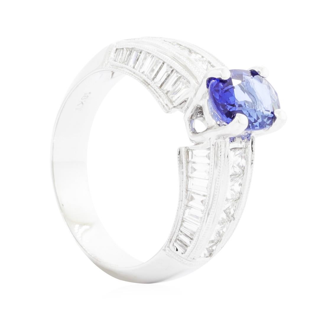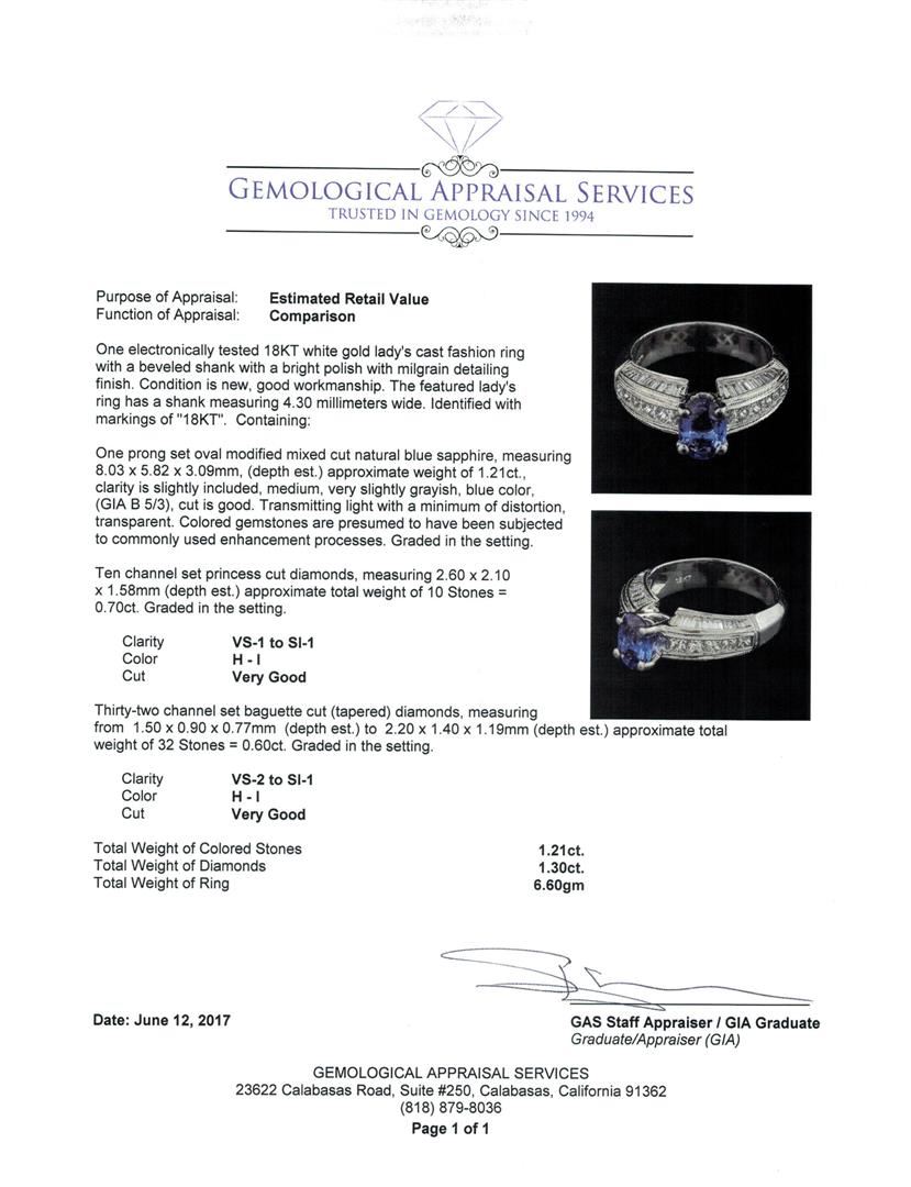 One electronically tested 18KT white gold lady's cast fashion ring with a beveled shank with a bright polish with milgrain detailing finish. The featured lady's ring has a shank measuring 4.30 millimeters wide. Identified with markings of '18KT'. Condition is new, good workmanship. Containing: One prong set oval modified mixed cut natural blue sapphire, measuring 8.03 x 5.82 x 3.09mm, (depth est.) approximate weight of 1.21ct., clarity is slightly included, medium, very slightly grayish, blue color, (GIA B 5/3), cut is good. Transmitting light with a minimum of distortion, transparent. Colored gemstones are presumed to have been subjected to commonly used enhancement processes. Graded in the setting. Ten channel set princess cut diamonds, measuring 2.60 x 2.10 x 1.58mm (depth est.) approximate total weight of 10 Stones = 0.70ct. Graded in the setting. Color H - I Clarity VS-1 to SI-1 Cut Very Good Thirty-Two channel set baguette cut (tapered) diamonds, measuring from 1.50 x 0.90 x 0.77mm (depth est.) to 2.20 x 1.40 x 1.19mm (depth est.) approximate total weight of 32 Stones = 0.60ct. Graded in the setting. Color H - I Clarity VS-2 to SI-1 Cut Very Good. Total Weight of Colored Stones 1.21ct.. Total Weight of Diamonds 1.30ct.. Total Weight of Ring 6.60gm GAS Appraised.