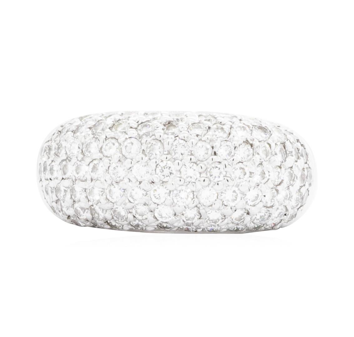 One electronically tested 18KT white gold lady's cast fashion ring with a wide band dome with a bright polish finish. The featured lady's ring has a shank measuring 3.40 millimeters wide. Identified with markings of '18K'. Condition is new, good workmanship. Containing: Ninety-Six prong set round brilliant cut diamonds, measuring 1.75 - 1.65 x 1.05mm (depth est.) approximate total weight of 96 Stones = 1.80ct. Graded in the setting. Color G - H Clarity VS-1 to SI-1 Cut Very Good. Total Weight of Diamonds 1.80ct.. Total Weight of Ring 9.50gm GAS Appraised.
