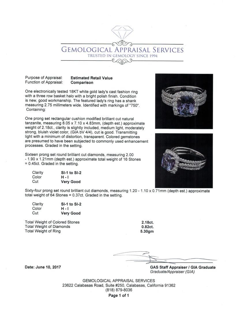 One electronically tested 18KT white gold lady's cast fashion ring with a three row basket halo with a bright polish finish. The featured lady's ring has a shank measuring 2.75 millimeters wide. Identified with markings of '750'. Condition is new, good workmanship. Containing: One prong set rectangular cushion modified brilliant cut natural tanzanite, measuring 8.05 x 7.10 x 4.83mm, (depth est.) approximate weight of 2.18ct., clarity is slightly included, medium light, moderately strong, bluish violet color, (GIA bV 4/4), cut is good. Transmitting light with a minimum of distortion, transparent. Colored gemstones are presumed to have been subjected to commonly used enhancement processes. Graded in the setting. Sixteen prong set round brilliant cut diamonds, measuring 2.00 - 1.90 x 1.21mm (depth est.) approximate total weight of 16 Stones = 0.45ct. Graded in the setting. Color H - I Clarity SI-1 to SI-2 Cut Very Good Sixty-Four prong set round brilliant cut diamonds, measuring 1.20 - 1.10 x 0.71mm (depth est.) approximate total weight of 64 Stones = 0.37ct. Graded in the setting. Color H - I Clarity SI-1 to SI-2 Cut Very Good. Total Weight of Colored Stones 2.18ct.. Total Weight of Diamonds 0.82ct.. Total Weight of Ring 5.30gm GAS Appraised.
