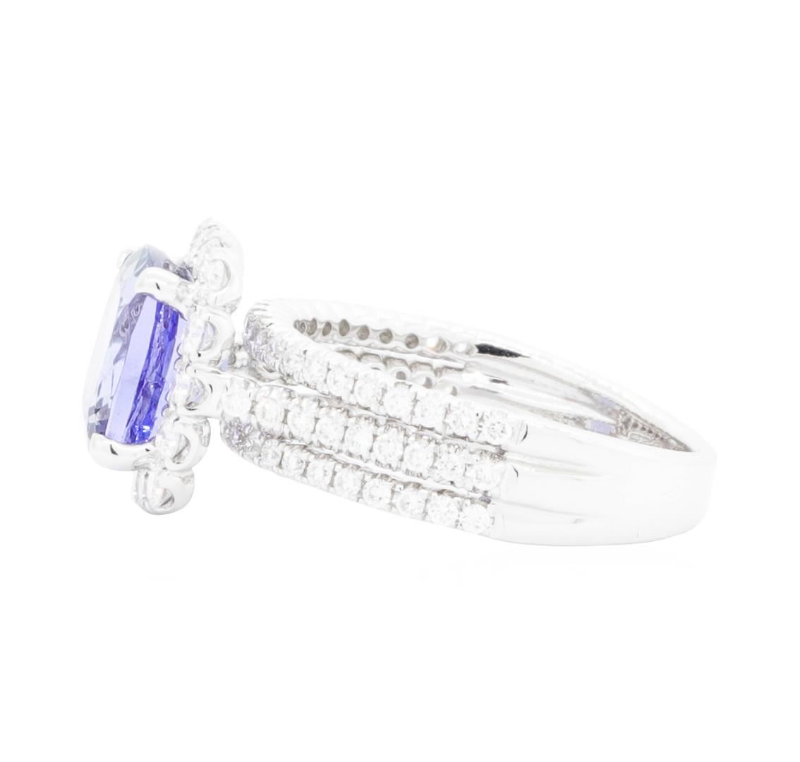 One electronically tested 18KT white gold lady's cast fashion ring with a three row basket halo with a bright polish finish. The featured lady's ring has a shank measuring 2.75 millimeters wide. Identified with markings of '750'. Condition is new, good workmanship. Containing: One prong set rectangular cushion modified brilliant cut natural tanzanite, measuring 8.05 x 7.10 x 4.83mm, (depth est.) approximate weight of 2.18ct., clarity is slightly included, medium light, moderately strong, bluish violet color, (GIA bV 4/4), cut is good. Transmitting light with a minimum of distortion, transparent. Colored gemstones are presumed to have been subjected to commonly used enhancement processes. Graded in the setting. Sixteen prong set round brilliant cut diamonds, measuring 2.00 - 1.90 x 1.21mm (depth est.) approximate total weight of 16 Stones = 0.45ct. Graded in the setting. Color H - I Clarity SI-1 to SI-2 Cut Very Good Sixty-Four prong set round brilliant cut diamonds, measuring 1.20 - 1.10 x 0.71mm (depth est.) approximate total weight of 64 Stones = 0.37ct. Graded in the setting. Color H - I Clarity SI-1 to SI-2 Cut Very Good. Total Weight of Colored Stones 2.18ct.. Total Weight of Diamonds 0.82ct.. Total Weight of Ring 5.30gm GAS Appraised.