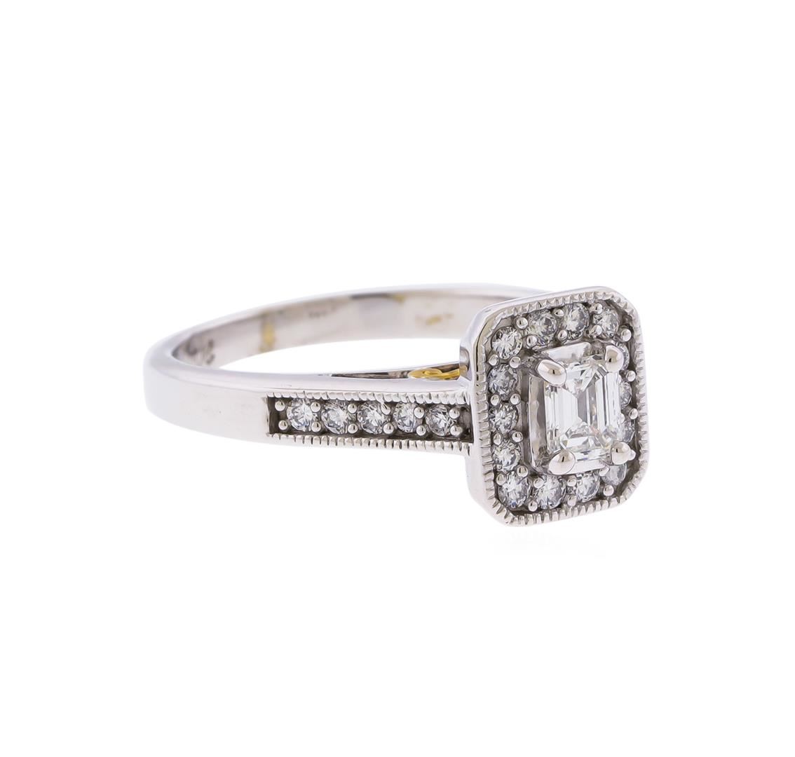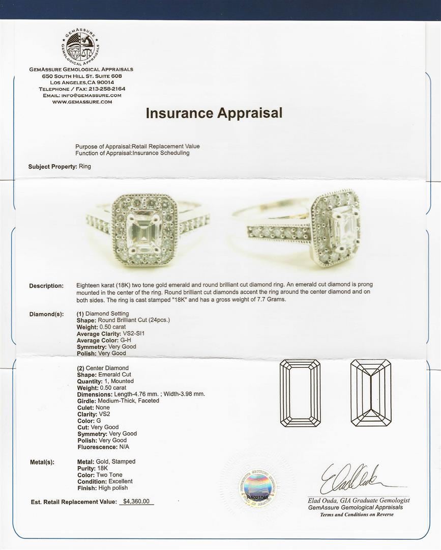Eighteen karat (18K) two tone gold emerald and round brilliant cut diamond ring. An emerald cut diamond, weighing approximately 0.50cts with a clarity of VS2 and a color of G, is mounted in the center of the ring. Round brilliant cut diamonds, weighing ap GGA Appraised at $4,360.00.