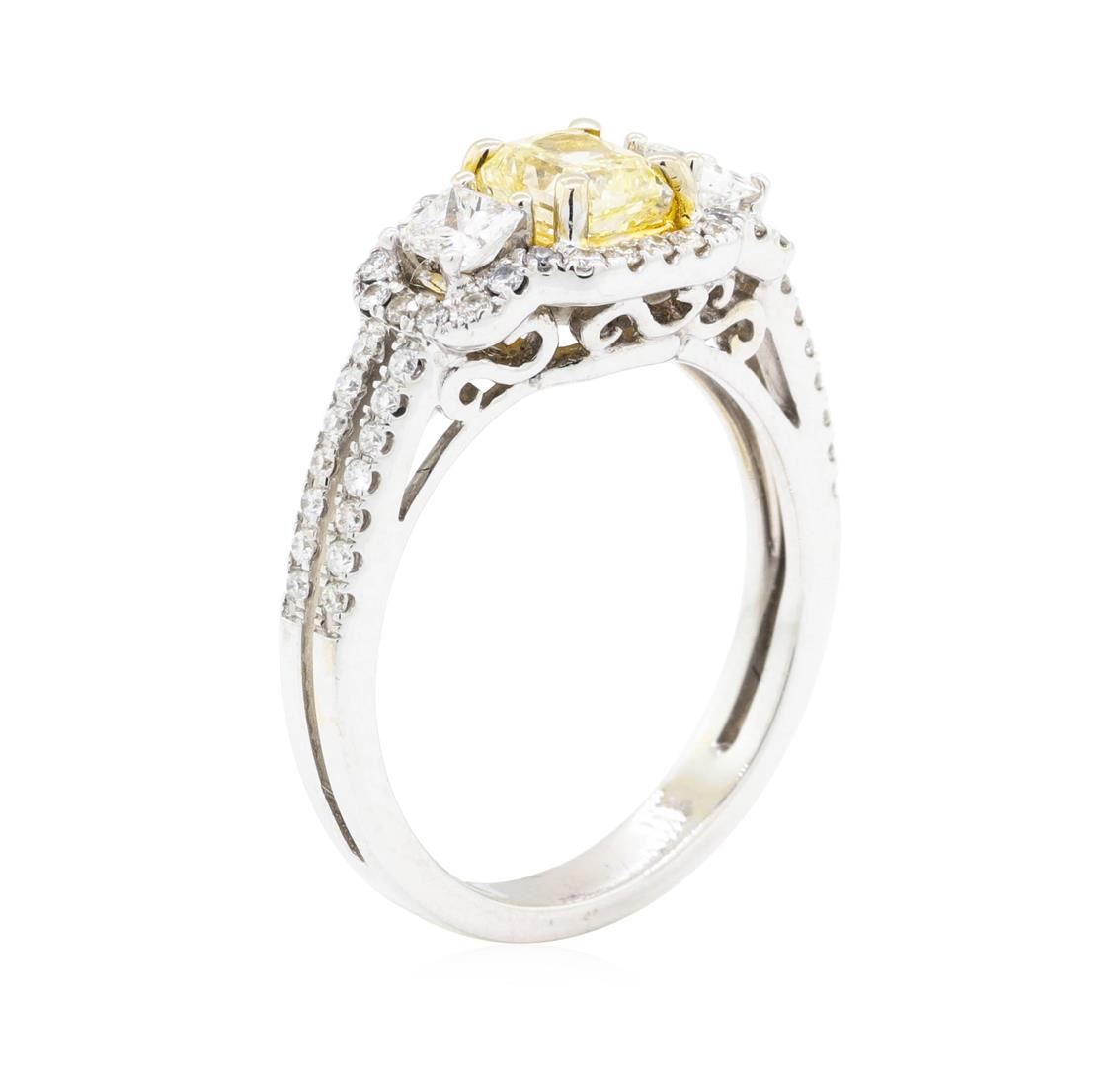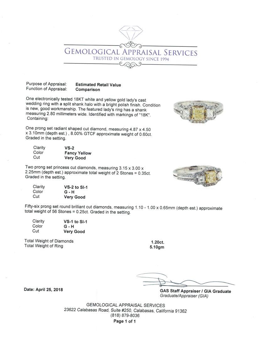 One electronically tested 18KT white and yellow gold Ladies cast wedding ring with a split shank halo with a bright polish finish. The featured Ladies ring has a shank measuring 2.80 millimeters wide. Identified with markings of '18K'. Condition is new, good workmanship. Containing: One prong set radiant shaped cut diamond, measuring 4.87 x 4.50 x 3.10mm (depth est.) , 8.00.%. GTCF approximate weight of 0.60ct. Graded in the setting. Color Fancy Yellow Clarity VS-2 Cut Very Good Two prong set princess cut diamonds, measuring 3.15 x 3.00 x 2.25mm (depth est.) approximate total weight of 2 Stones = 0.35ct. Graded in the setting. Color G - H Clarity VS-2 to SI-1 Cut Very Good Fifty-Six prong set round brilliant cut diamonds, measuring 1.10 - 1.00 x 0.65mm (depth est.) approximate total weight of 56 Stones = 0.25ct. Graded in the setting. Color G - H Clarity VS-1 to SI-1 Cut Very Good. Total Weight of Diamonds 1.20ct.. Total Weight of Ring 5.10gm. GAS Appraised.