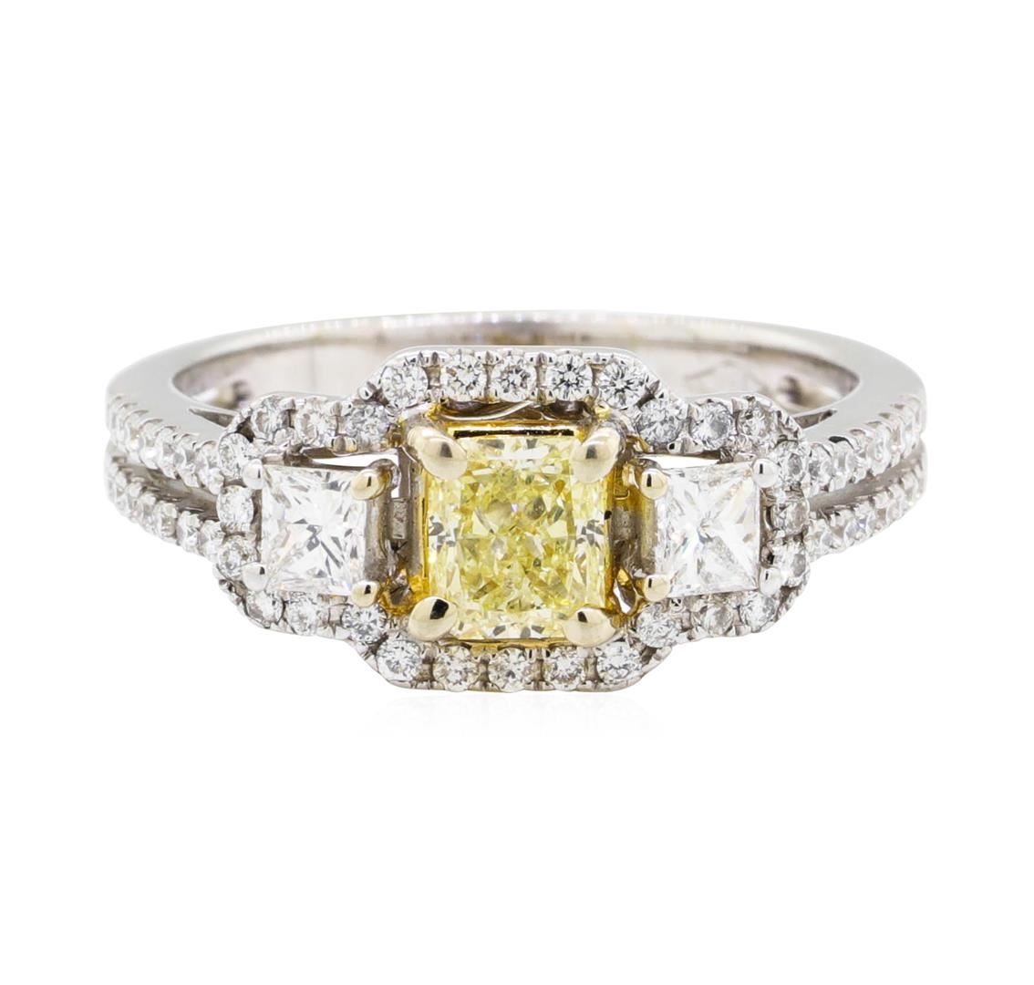 One electronically tested 18KT white and yellow gold Ladies cast wedding ring with a split shank halo with a bright polish finish. The featured Ladies ring has a shank measuring 2.80 millimeters wide. Identified with markings of '18K'. Condition is new, good workmanship. Containing: One prong set radiant shaped cut diamond, measuring 4.87 x 4.50 x 3.10mm (depth est.) , 8.00.%. GTCF approximate weight of 0.60ct. Graded in the setting. Color Fancy Yellow Clarity VS-2 Cut Very Good Two prong set princess cut diamonds, measuring 3.15 x 3.00 x 2.25mm (depth est.) approximate total weight of 2 Stones = 0.35ct. Graded in the setting. Color G - H Clarity VS-2 to SI-1 Cut Very Good Fifty-Six prong set round brilliant cut diamonds, measuring 1.10 - 1.00 x 0.65mm (depth est.) approximate total weight of 56 Stones = 0.25ct. Graded in the setting. Color G - H Clarity VS-1 to SI-1 Cut Very Good. Total Weight of Diamonds 1.20ct.. Total Weight of Ring 5.10gm. GAS Appraised.