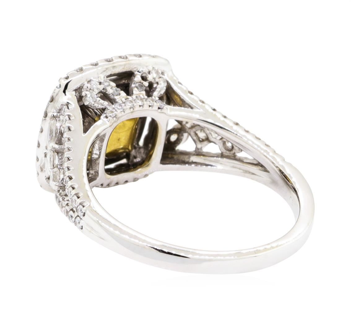 One electronically tested 18KT white and yellow gold lady's combination cast & assembled wedding ring with a square cushion double basket halo with a bright polish finish. The featured lady's ring has a shank measuring 1.95 millimeters wide. Identified with markings of '750'. Condition is like new, good workmanship. Containing: One prong set round brilliant cut diamond, measuring 7.41 - 7.39 x 4.59mm (depth est.) approximate weight of 1.54ct. Graded in the setting. Color Y - Z Clarity VS-2 Cut Good Four prong set marquise shaped cut diamonds, measuring 2.50 x 1.50 x 0.95mm (depth est.) approximate total weight of 4 Stones = 0.09ct. Graded in the setting. Color H - I Clarity VS-2 to SI-1 Cut Good Two prong set princess cut diamonds, measuring 2.20 x 2.20 x 1.65mm (depth est.) approximate total weight of 2 Stones = 0.14ct. Graded in the setting. Color H - I Clarity VS-1 to VS-2 Cut Good Two prong set round brilliant cut diamonds, measuring 1.80 - 1.75 x 1.10mm (depth est.) approximate total weight of 2 Stones = 0.04ct. Graded in the setting. Color H - I Clarity VS-2 to SI-1 Cut Good Sixteen prong set round brilliant cut diamonds, measuring 1.50 - 1.45 x 0.92mm (depth est.) approximate total weight of 16 Stones = 0.20ct. Graded in the setting. Color H - I Clarity SI-1 to SI-2 Cut Very Good One Hundred prong set round brilliant cut diamonds, measuring 1.20 - 1.00 x 0.68mm (depth est.) approximate total weight of 100 Stones = 0.50ct. Graded in the setting. Color H - I Clarity VS-2 to SI-1 Cut Good. Total Weight of Diamonds 2.51ct. Total Weight of Ring 6.20gm. GAS Appraised.