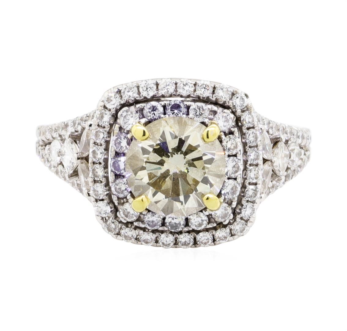 One electronically tested 18KT white and yellow gold lady's combination cast & assembled wedding ring with a square cushion double basket halo with a bright polish finish. The featured lady's ring has a shank measuring 1.95 millimeters wide. Identified with markings of '750'. Condition is like new, good workmanship. Containing: One prong set round brilliant cut diamond, measuring 7.41 - 7.39 x 4.59mm (depth est.) approximate weight of 1.54ct. Graded in the setting. Color Y - Z Clarity VS-2 Cut Good Four prong set marquise shaped cut diamonds, measuring 2.50 x 1.50 x 0.95mm (depth est.) approximate total weight of 4 Stones = 0.09ct. Graded in the setting. Color H - I Clarity VS-2 to SI-1 Cut Good Two prong set princess cut diamonds, measuring 2.20 x 2.20 x 1.65mm (depth est.) approximate total weight of 2 Stones = 0.14ct. Graded in the setting. Color H - I Clarity VS-1 to VS-2 Cut Good Two prong set round brilliant cut diamonds, measuring 1.80 - 1.75 x 1.10mm (depth est.) approximate total weight of 2 Stones = 0.04ct. Graded in the setting. Color H - I Clarity VS-2 to SI-1 Cut Good Sixteen prong set round brilliant cut diamonds, measuring 1.50 - 1.45 x 0.92mm (depth est.) approximate total weight of 16 Stones = 0.20ct. Graded in the setting. Color H - I Clarity SI-1 to SI-2 Cut Very Good One Hundred prong set round brilliant cut diamonds, measuring 1.20 - 1.00 x 0.68mm (depth est.) approximate total weight of 100 Stones = 0.50ct. Graded in the setting. Color H - I Clarity VS-2 to SI-1 Cut Good. Total Weight of Diamonds 2.51ct. Total Weight of Ring 6.20gm. GAS Appraised.