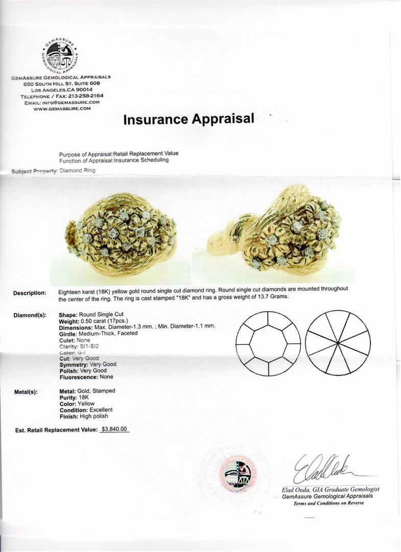One 18KT Yellow Gold 0.50ctw Diamond Ring with a total weight of 13.5 grams. Diamonds with a total weight of 0.50cts. GGA Appraised at $3,840.00.