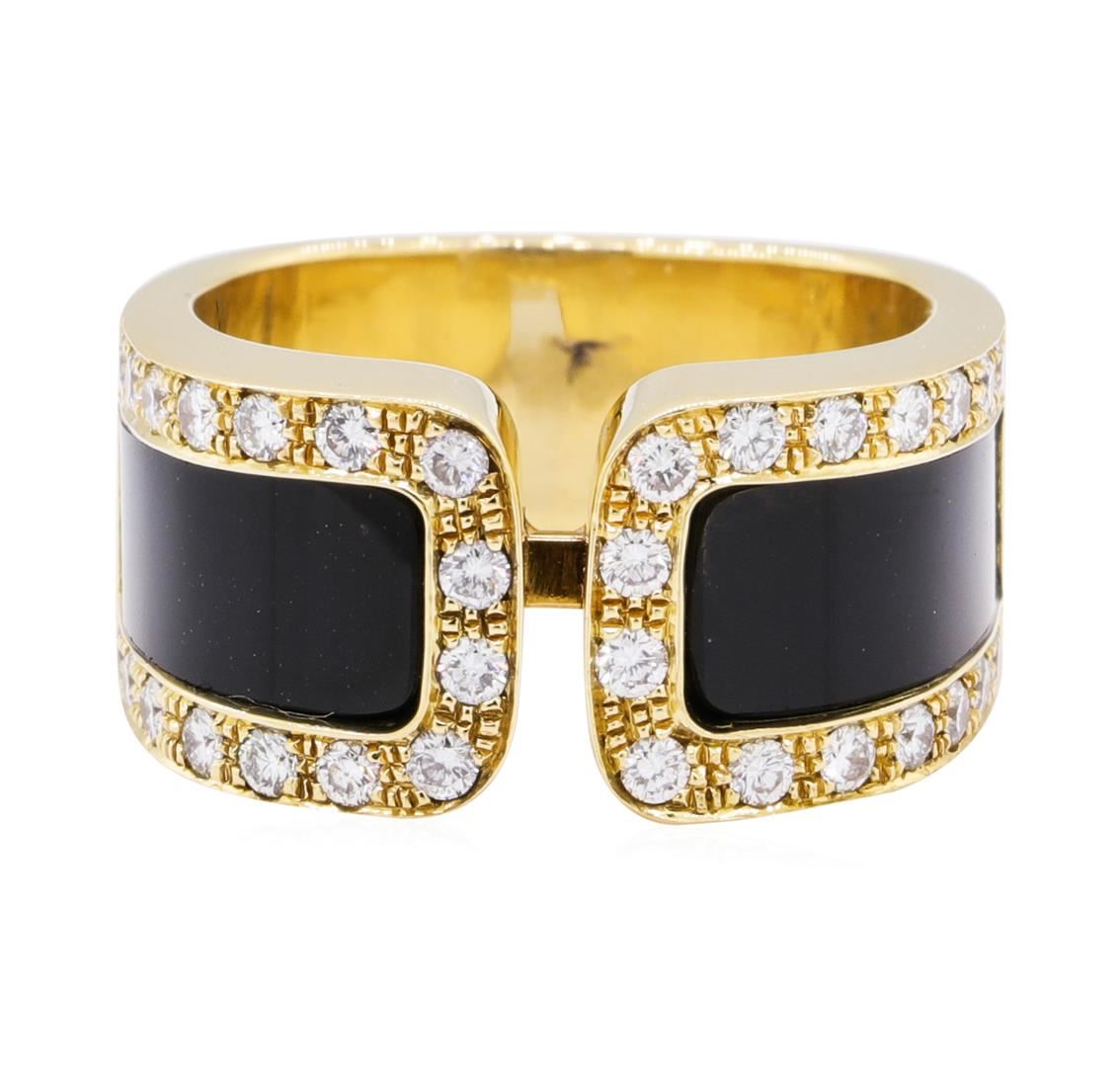 One electronically tested 18KT yellow gold lady's cast fashion ring with a square shank with a bright polish finish. The featured lady's ring has two pieces of custom cut inlaid onyx and has a shank measuring 7.30 millimeters wide. Identified with markings of '18K'. Condition is new, good workmanship. Containing: Thirty-Two prong set round brilliant cut diamonds, measuring 1.70 - 1.65 x 1.04mm (depth est.) approximate total weight of 32 Stones = 0.60ct. Graded in the setting. Color F - G, Clarity VS-1 to VS-2, Cut Very Good. Total Weight of Diamonds 0.60ct. Total Weight of Ring 15.20gm. GAS Appraised.