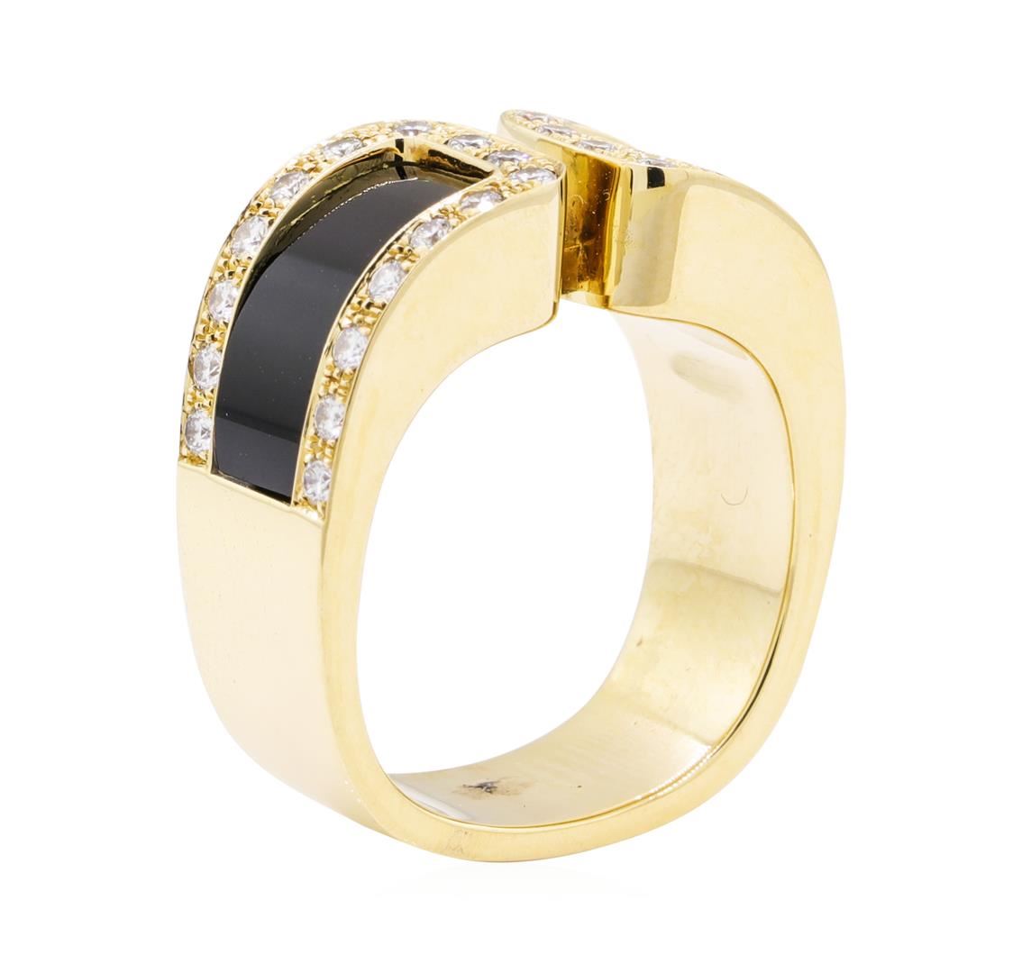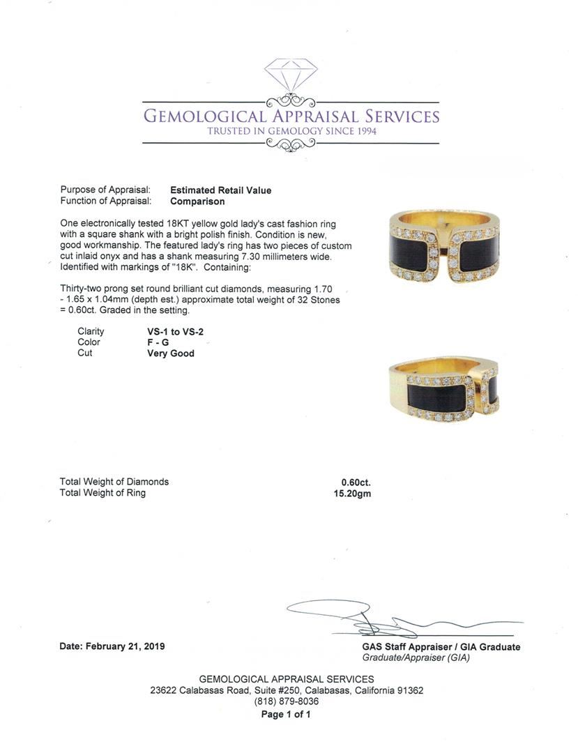 One electronically tested 18KT yellow gold lady's cast fashion ring with a square shank with a bright polish finish. The featured lady's ring has two pieces of custom cut inlaid onyx and has a shank measuring 7.30 millimeters wide. Identified with markings of '18K'. Condition is new, good workmanship. Containing: Thirty-Two prong set round brilliant cut diamonds, measuring 1.70 - 1.65 x 1.04mm (depth est.) approximate total weight of 32 Stones = 0.60ct. Graded in the setting. Color F - G, Clarity VS-1 to VS-2, Cut Very Good. Total Weight of Diamonds 0.60ct. Total Weight of Ring 15.20gm. GAS Appraised.