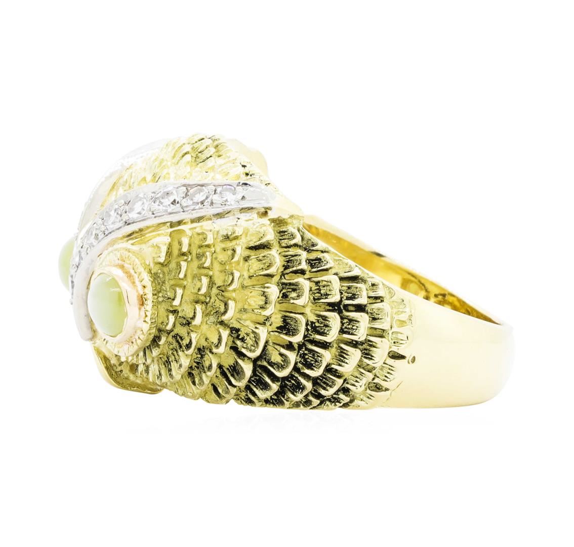 One electronically tested 18KT yellow gold Ladies combination cast & assembled fashion ring with a tapered shank with a bright polish finish. The featured Ladies ring has an owl motif and a shank measuring 4.28 millimeters wide. Identified with markings of '18K'. Condition is new, good workmanship. Containing: Two bezel set round cabochon cut natural cat's eye chrysoberyls, measuring 4.10 x 3.95 x 2.40mm, (depth est.) approximate total weight of 0.80ct., medium, moderately strong, strongly yellowish green color, (GIA styG 5/4), cut is very good. This stone has a complete eye with strong intensity, excellent movement, very good centering. Colored gemstones are presumed to have been subjected to commonly used enhancement processes. Graded in the setting. Fifteen bead set single cut diamonds, measuring 2.00 - 1.50 x 1.05mm (depth est.) approximate total weight of 15 Stones = 0.25ct. Graded in the setting. Color G - H Clarity VS-2 to SI-1 Cut Good. Total Weight of Colored Stones 0.80ct. Total Weight of Diamonds 0.25ct. Total Weight of Ring 17.90gm. GAS Appraised.
